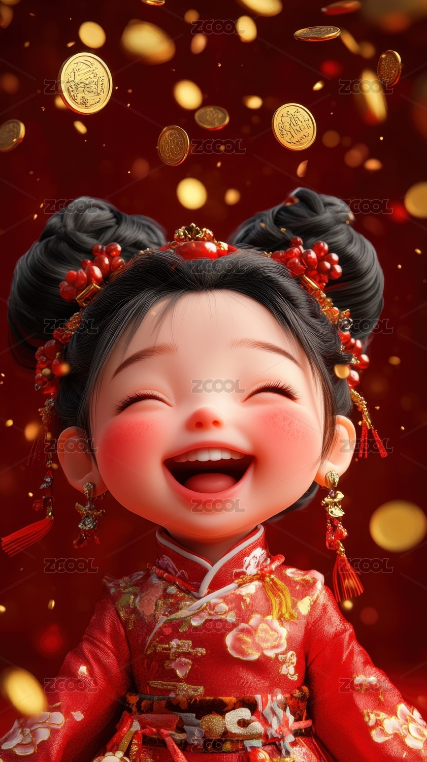 可爱中国女孩新年金币纷飞