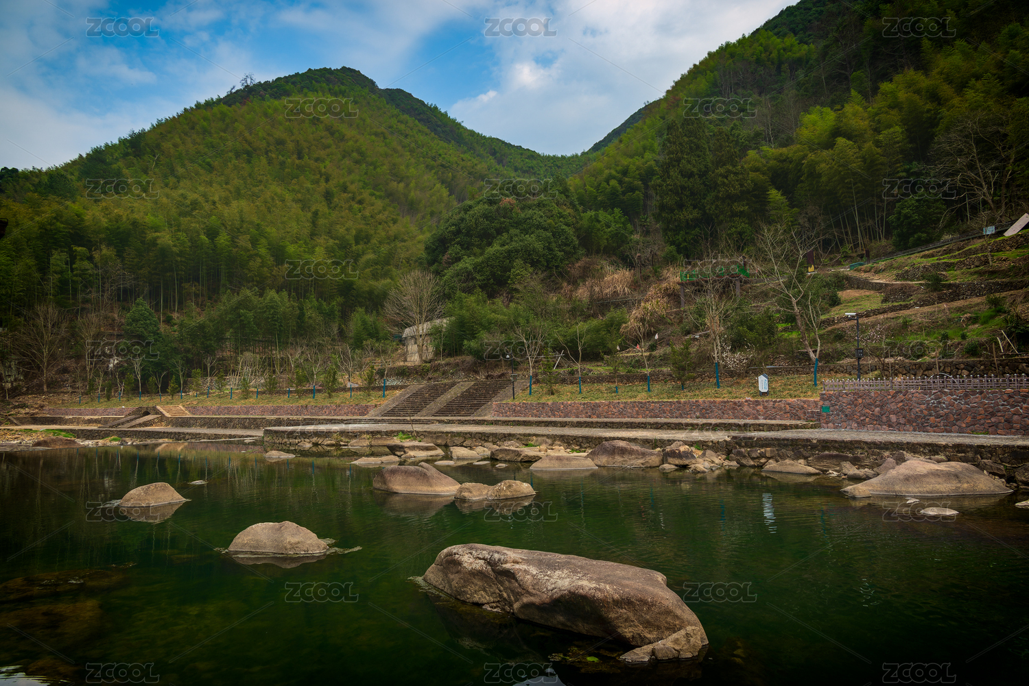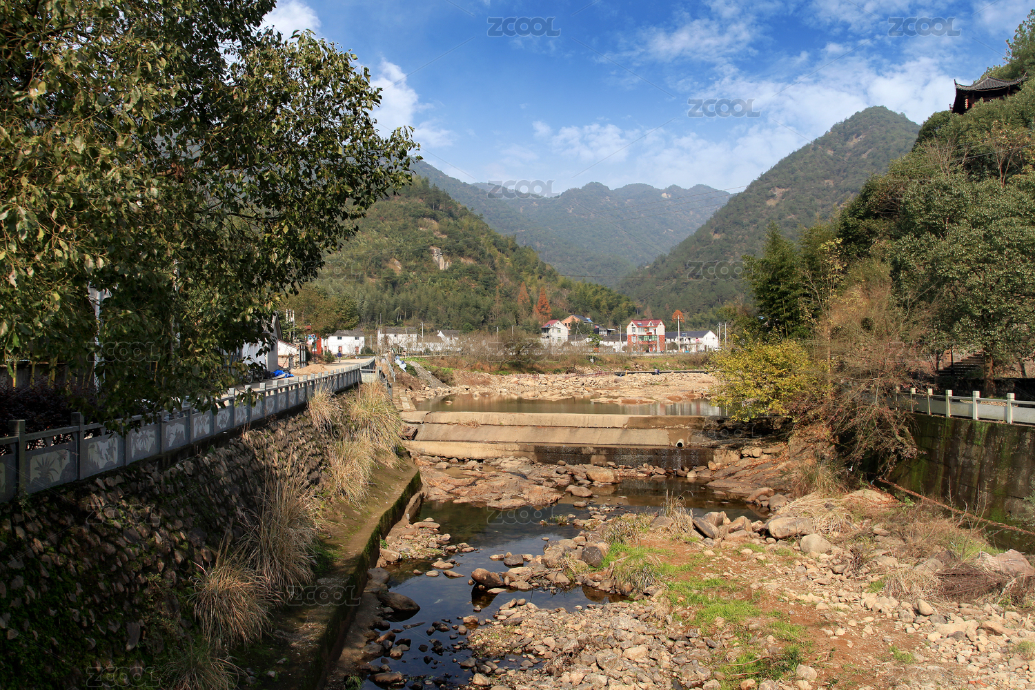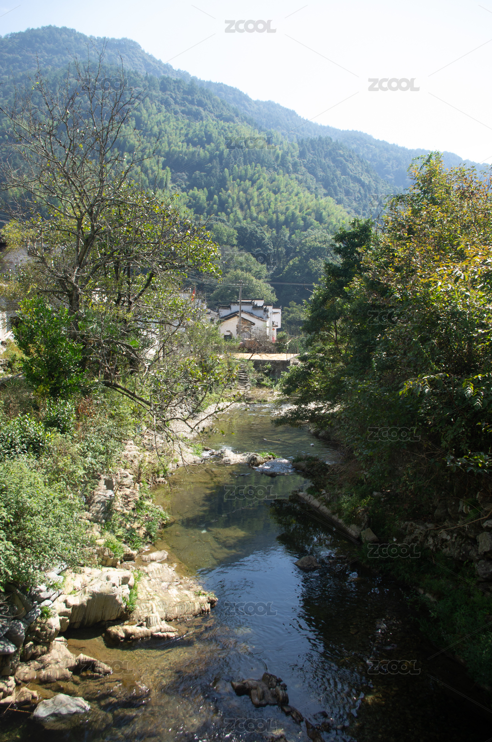 蓝天白云下安徽黟县美丽西宏古道山涧风光