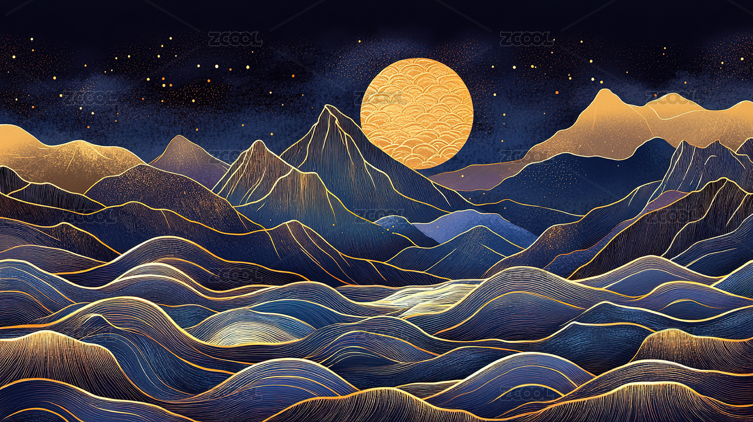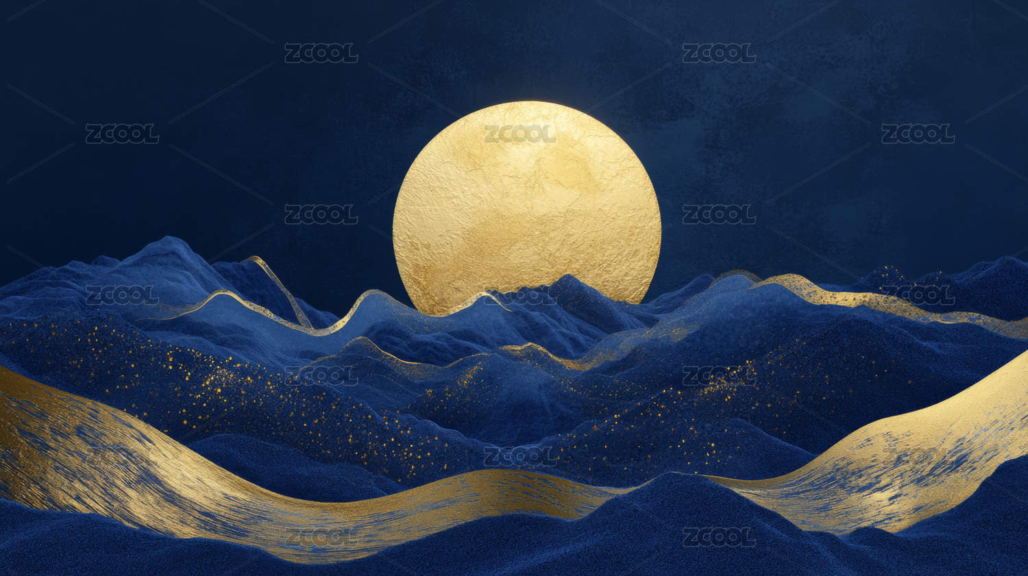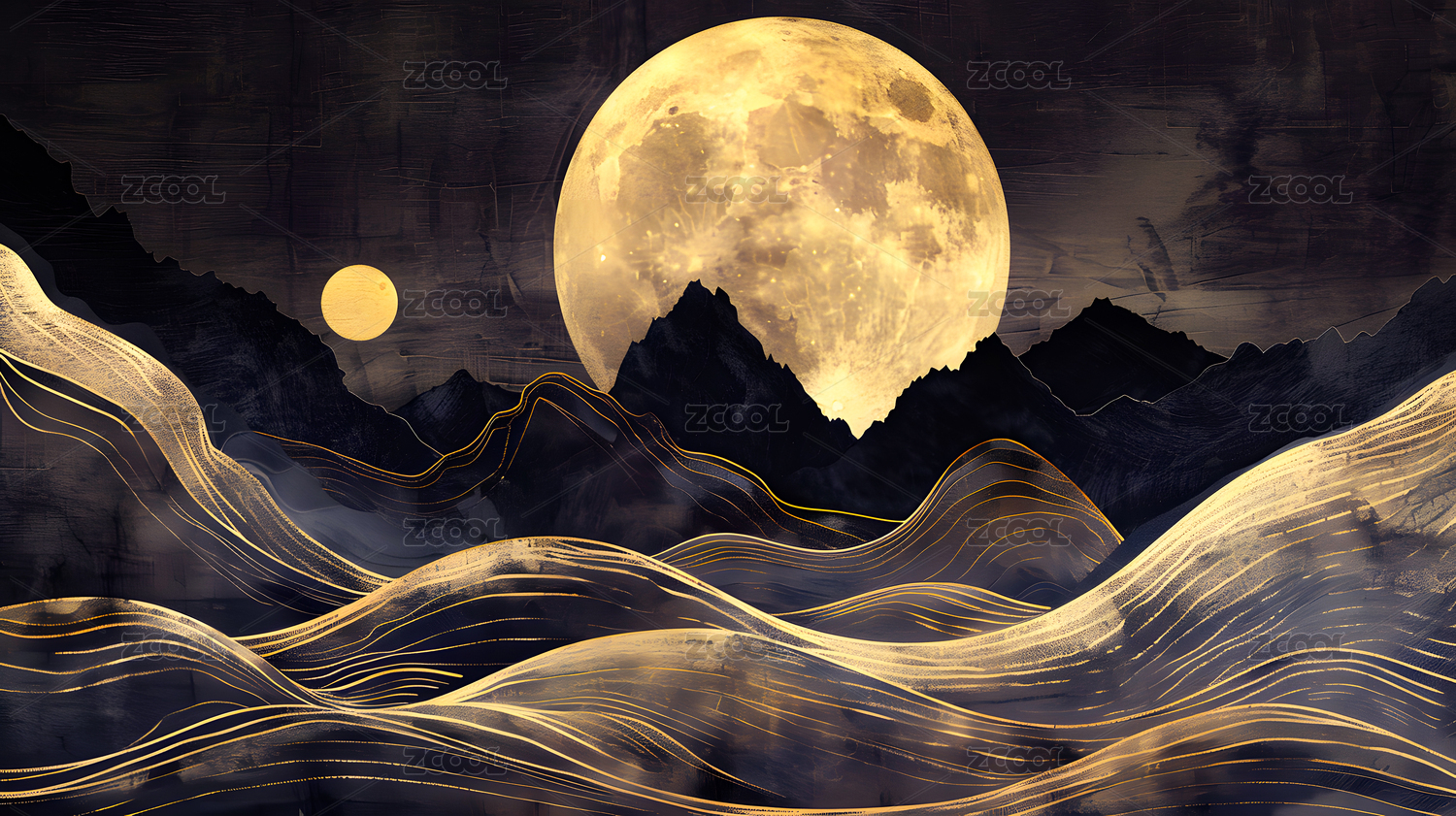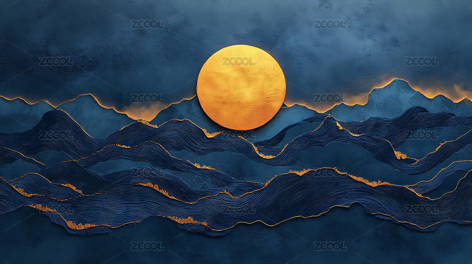 中国风太阳月亮黑金山水云雾背景壁纸新国风