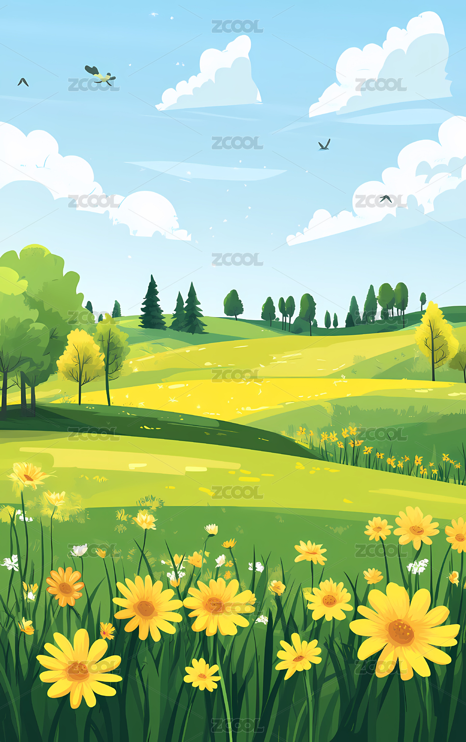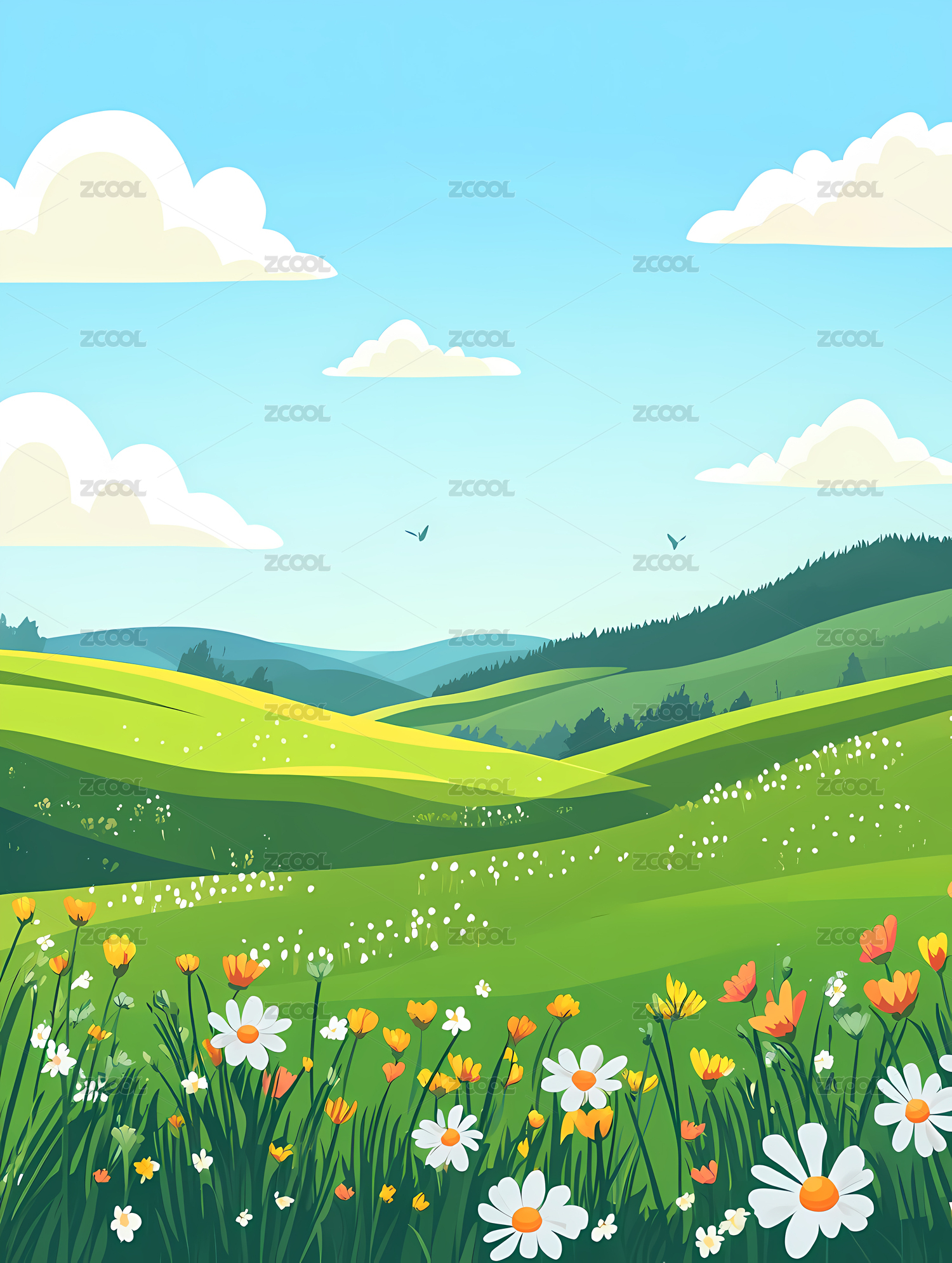 草地山脉山野风光插画