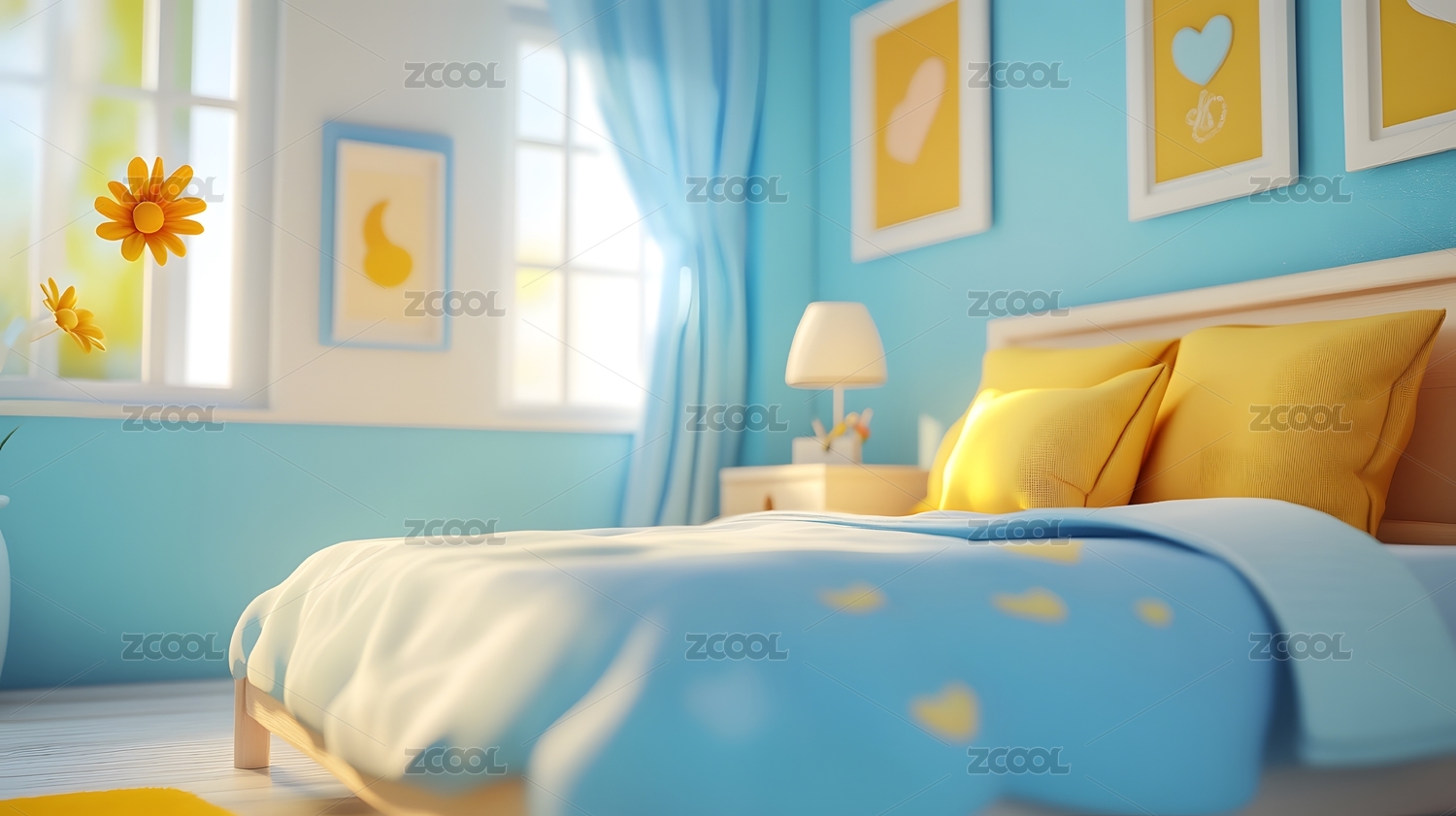 暖冷色卧室室内装饰装修特写3D卡通插画