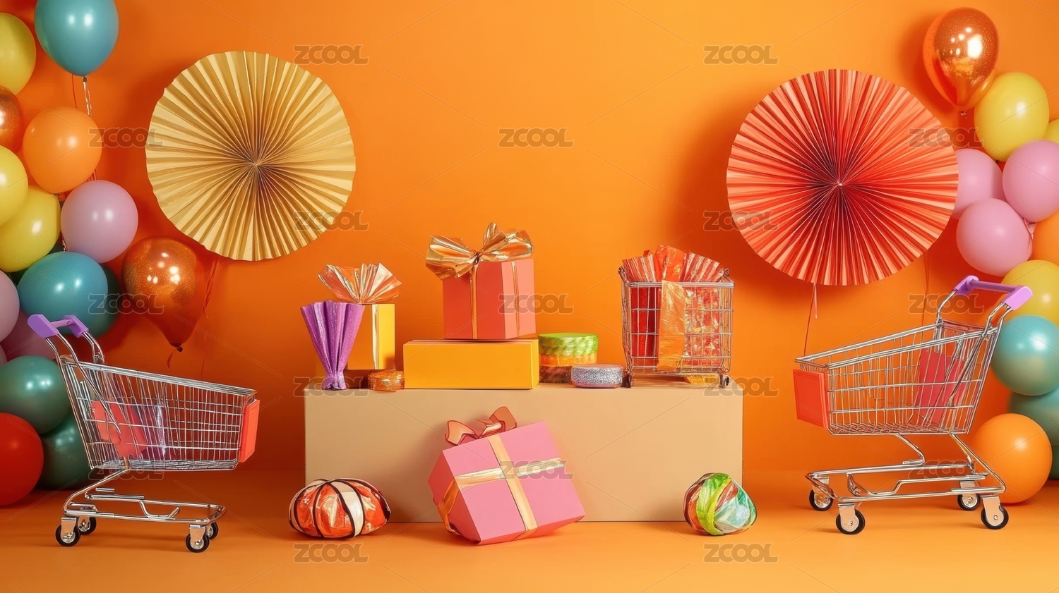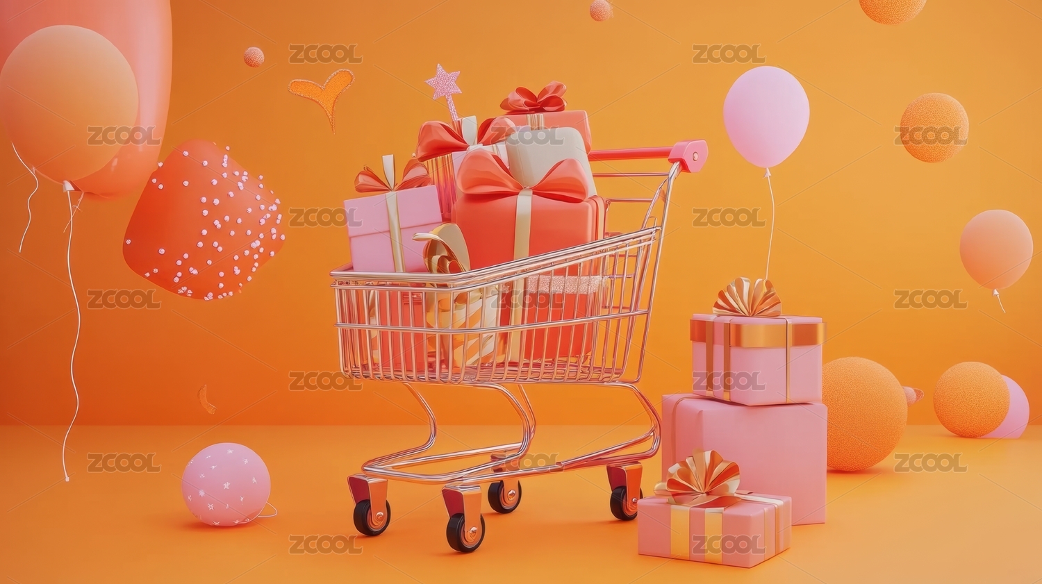 3D卡通金色购物车礼物盒节日活动场景