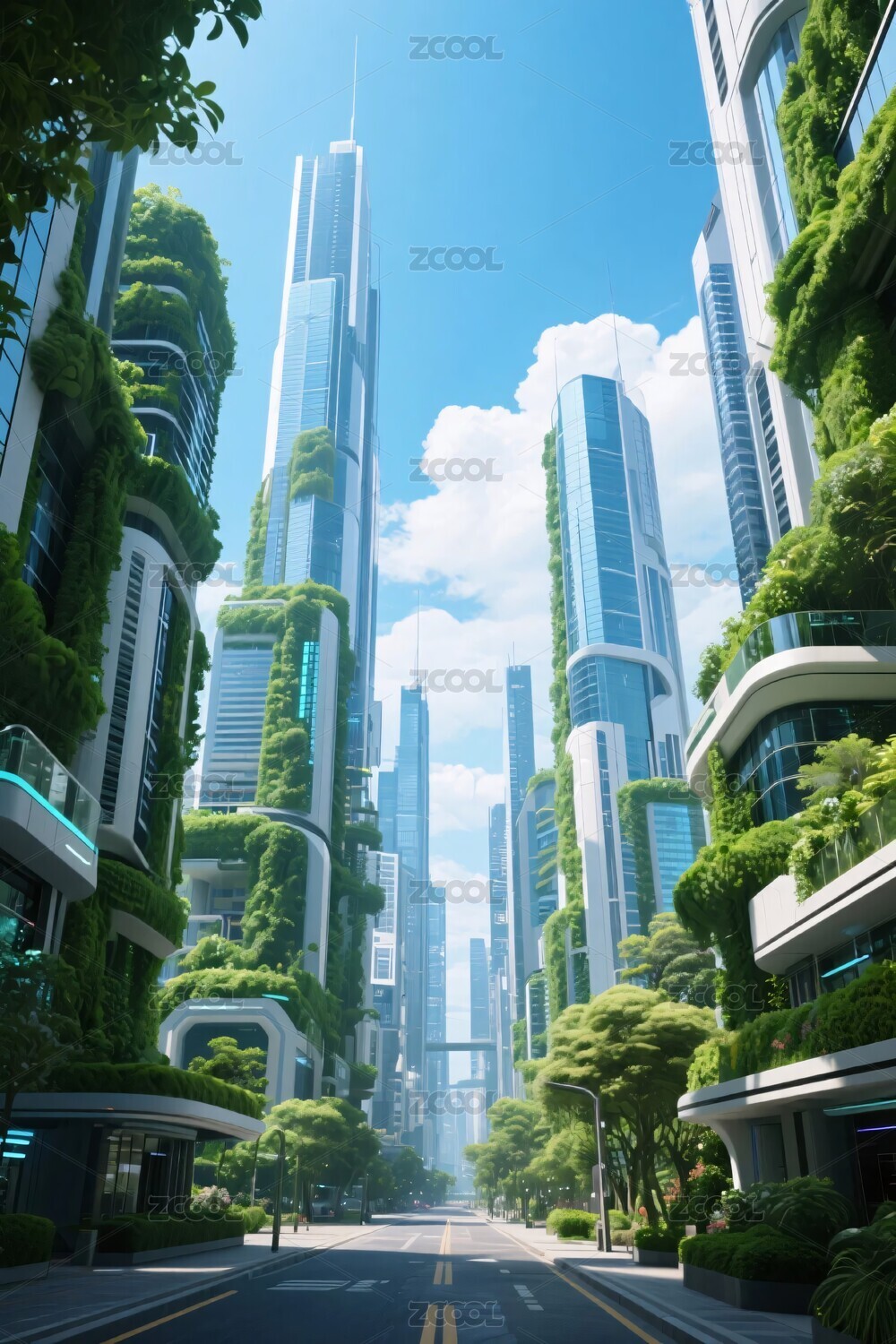 科幻长满绿色植物的城市道路侧高楼3D插画
