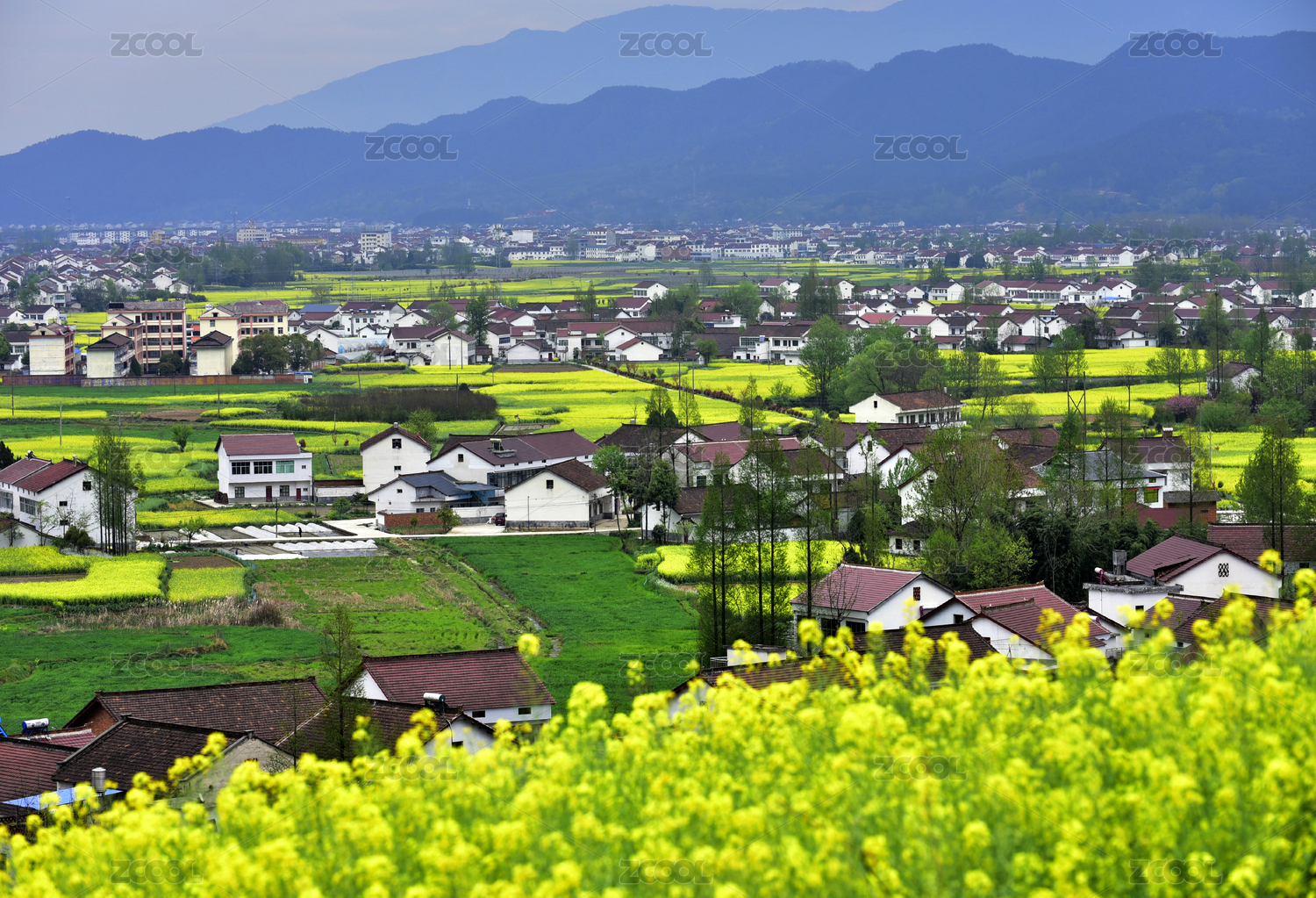 陕西省汉中市新集镇春天油菜花田绽放的村庄