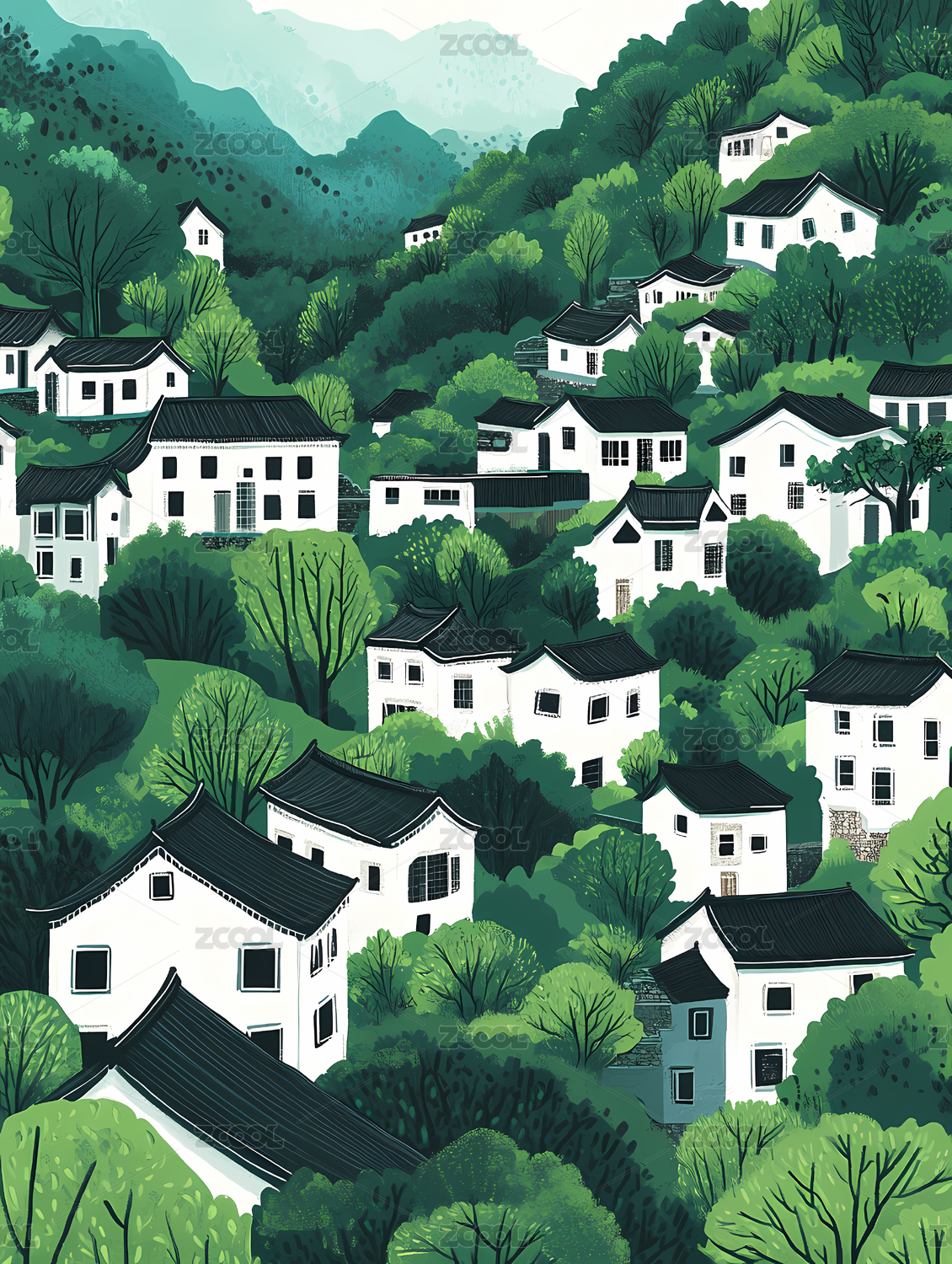 房屋,树木,桃花,乡村,蓝顶,白墙,村落,风景,插画,春天