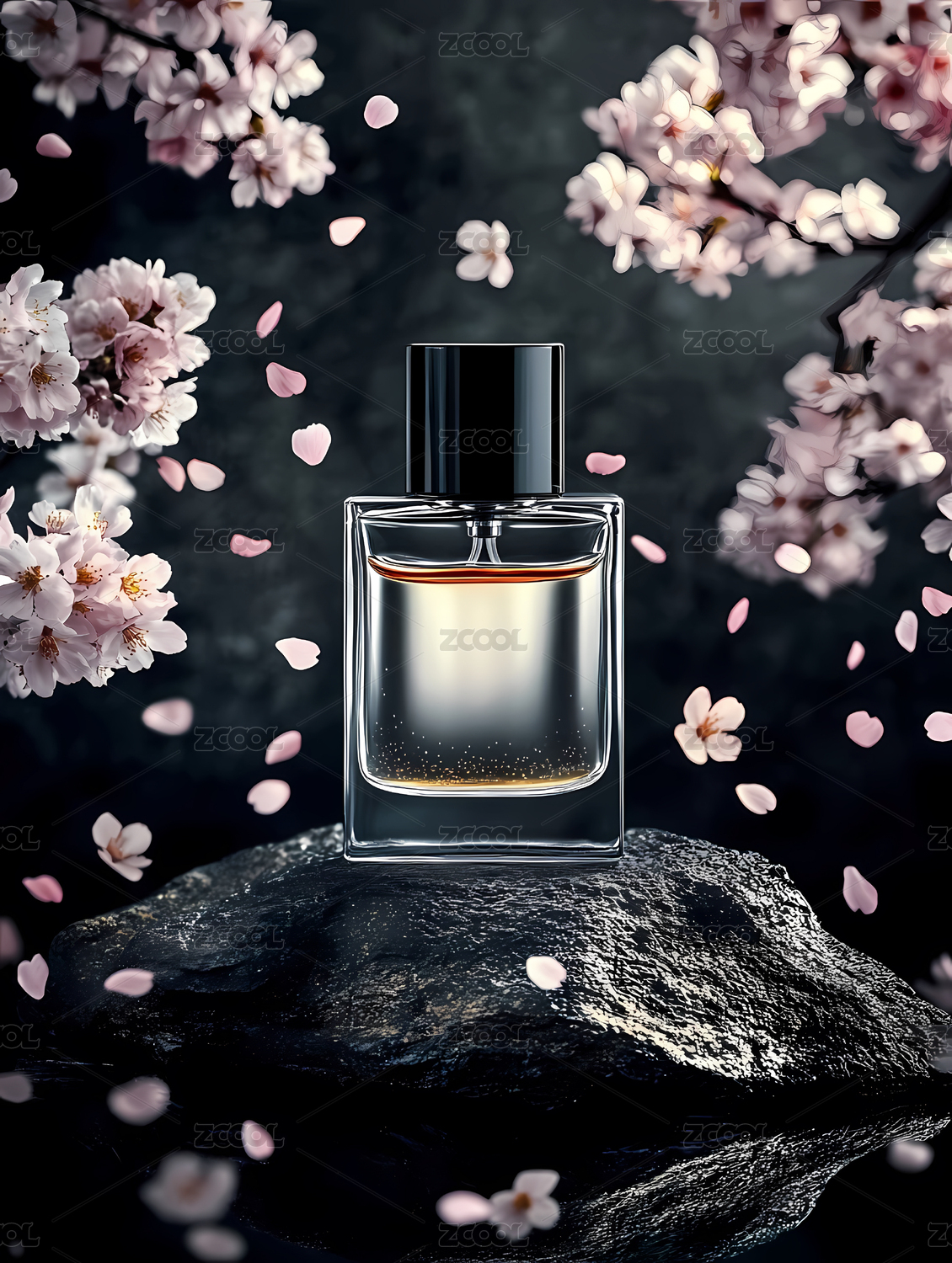 香水瓶置于樱花环绕的岩石上