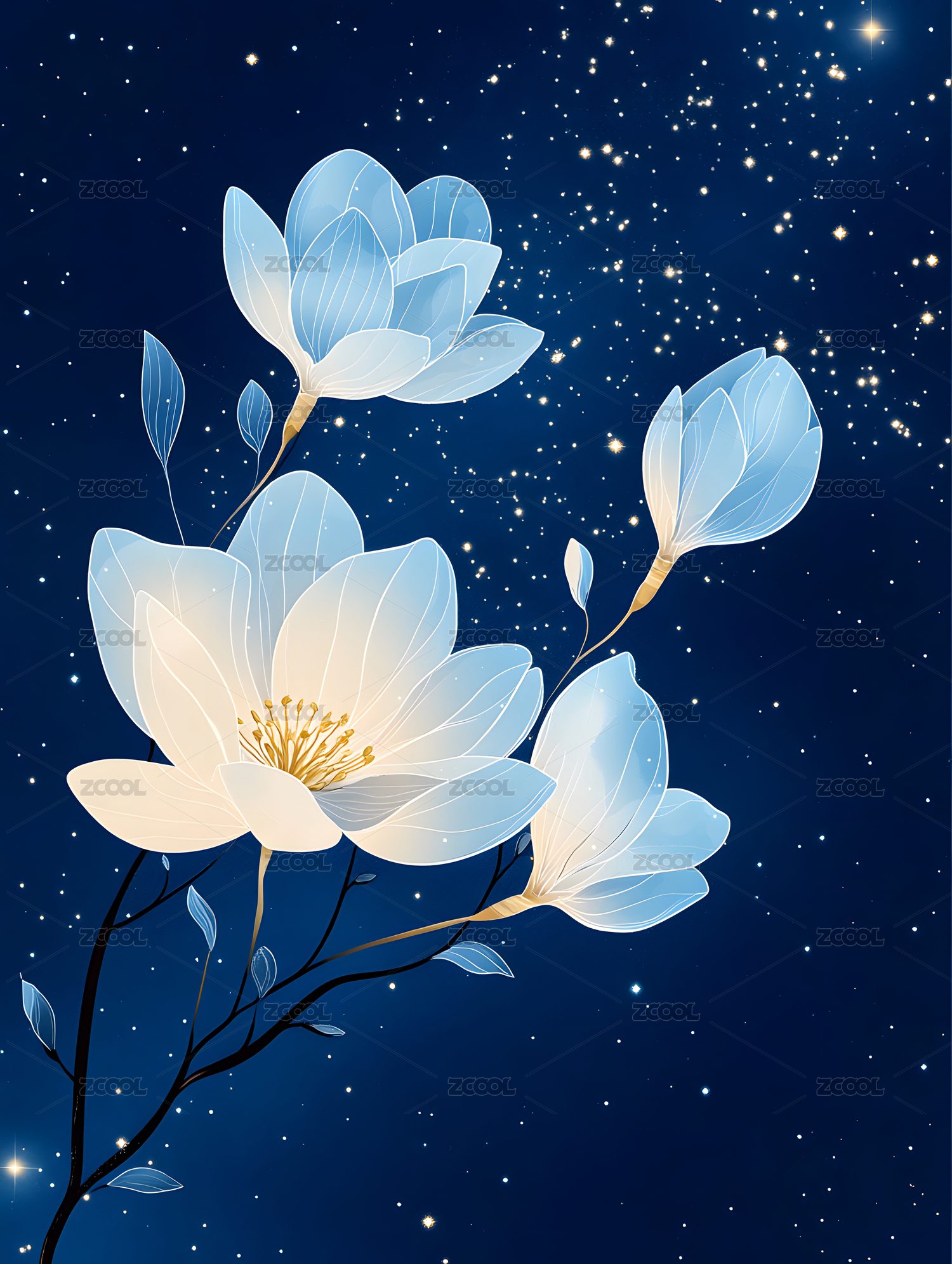星空下的蓝白花朵