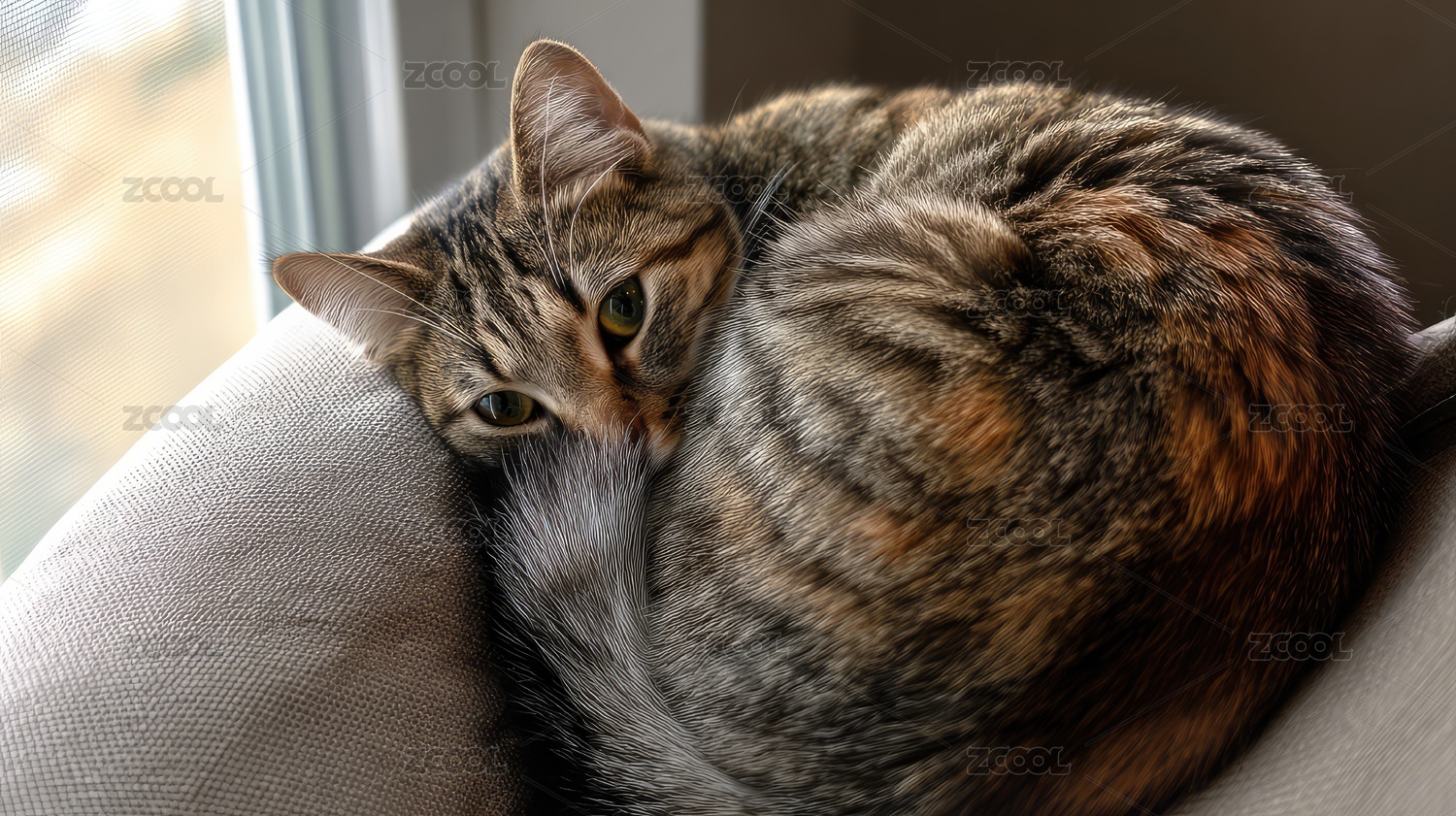 可爱的虎斑猫蜷缩在中性色调的软垫上