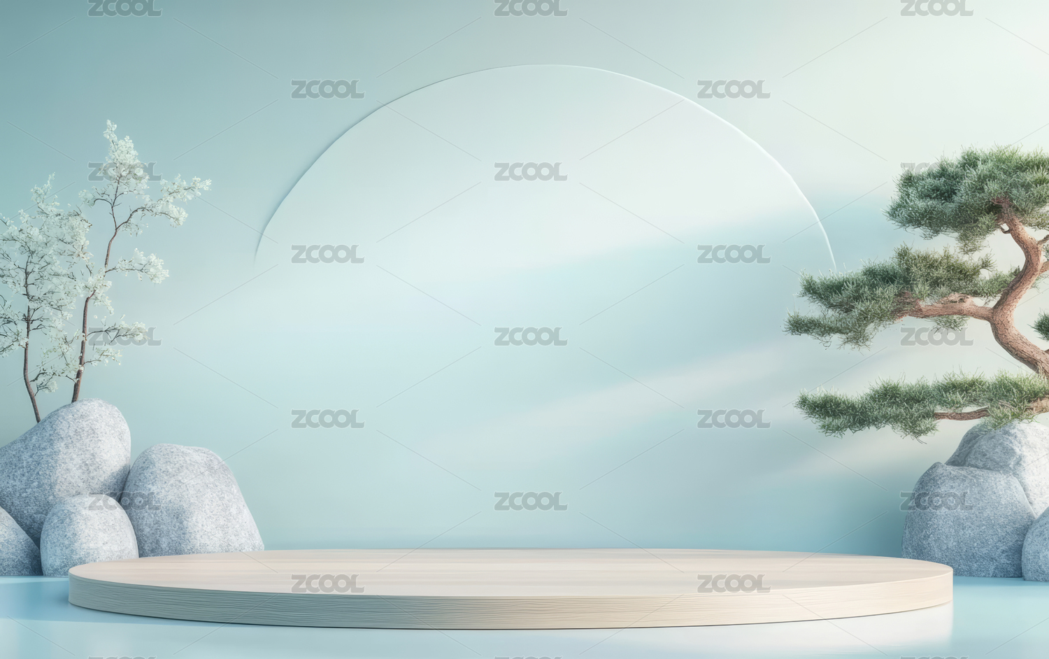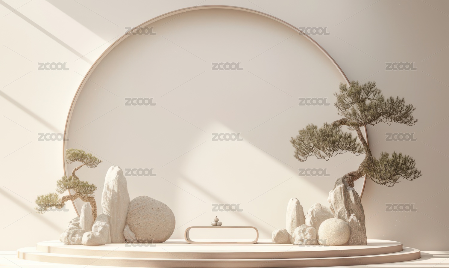 新中式圆形产品静物展示台有迎客松假山装饰