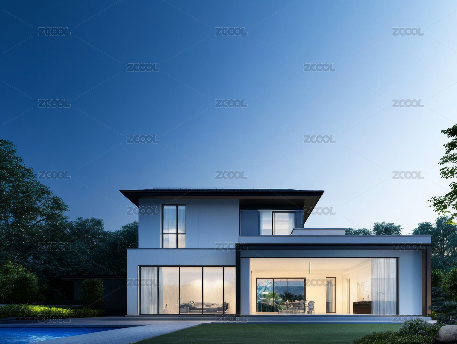 现代,别墅,豪华,外观,游泳池,花园,玻璃窗,灯光,设计,建筑