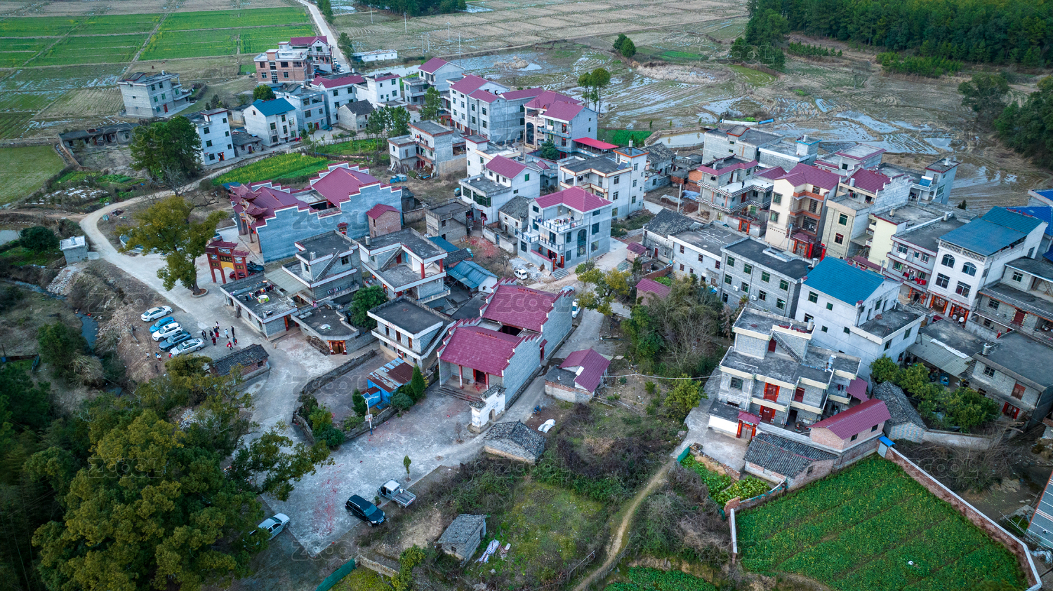 航拍冬季清晨中国广东梅州兴宁城镇乡村发展