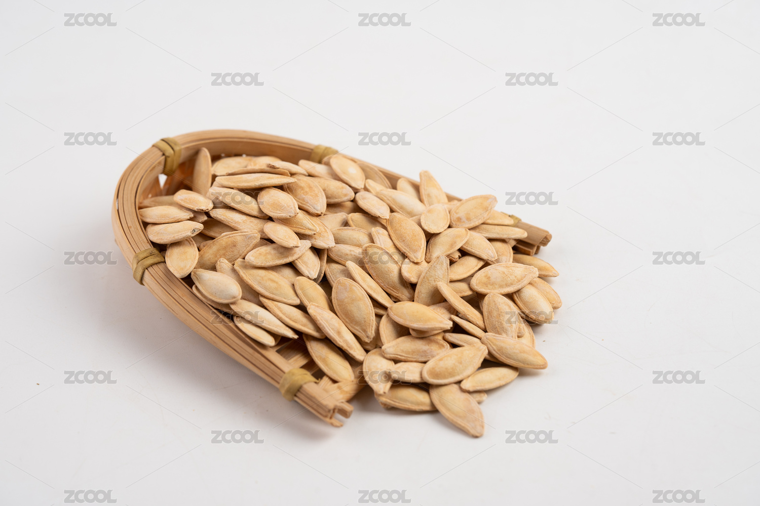 白色背景上木碗里的椒盐味美人甲南瓜子