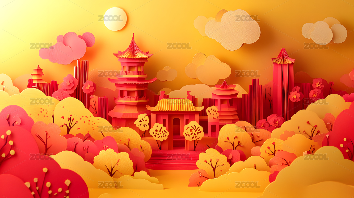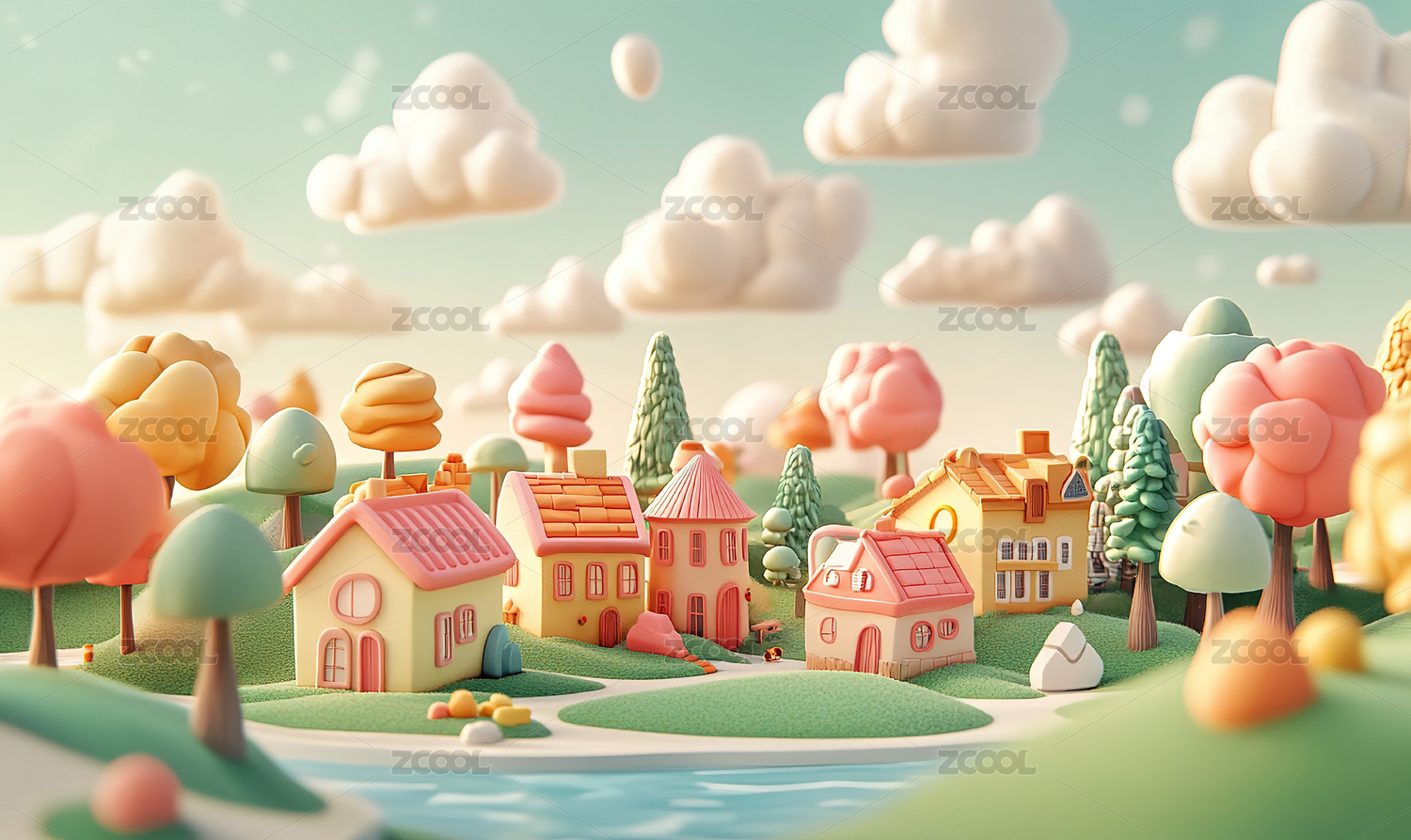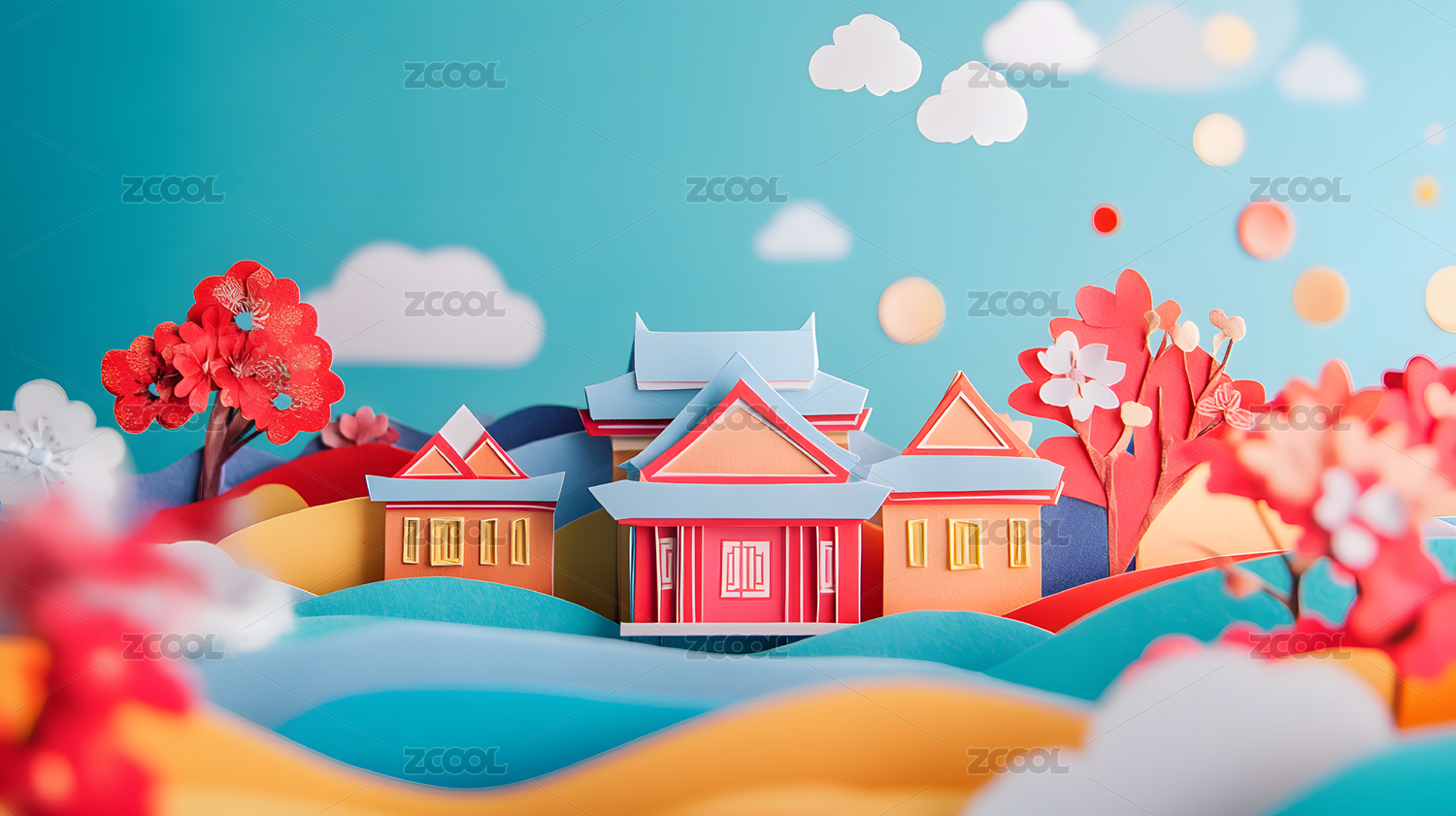 纸艺,山峦,景色,建筑,云朵,天空,房屋,景观,彩色,梦幻