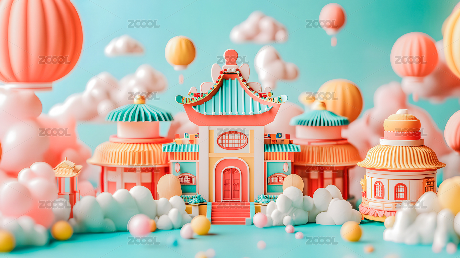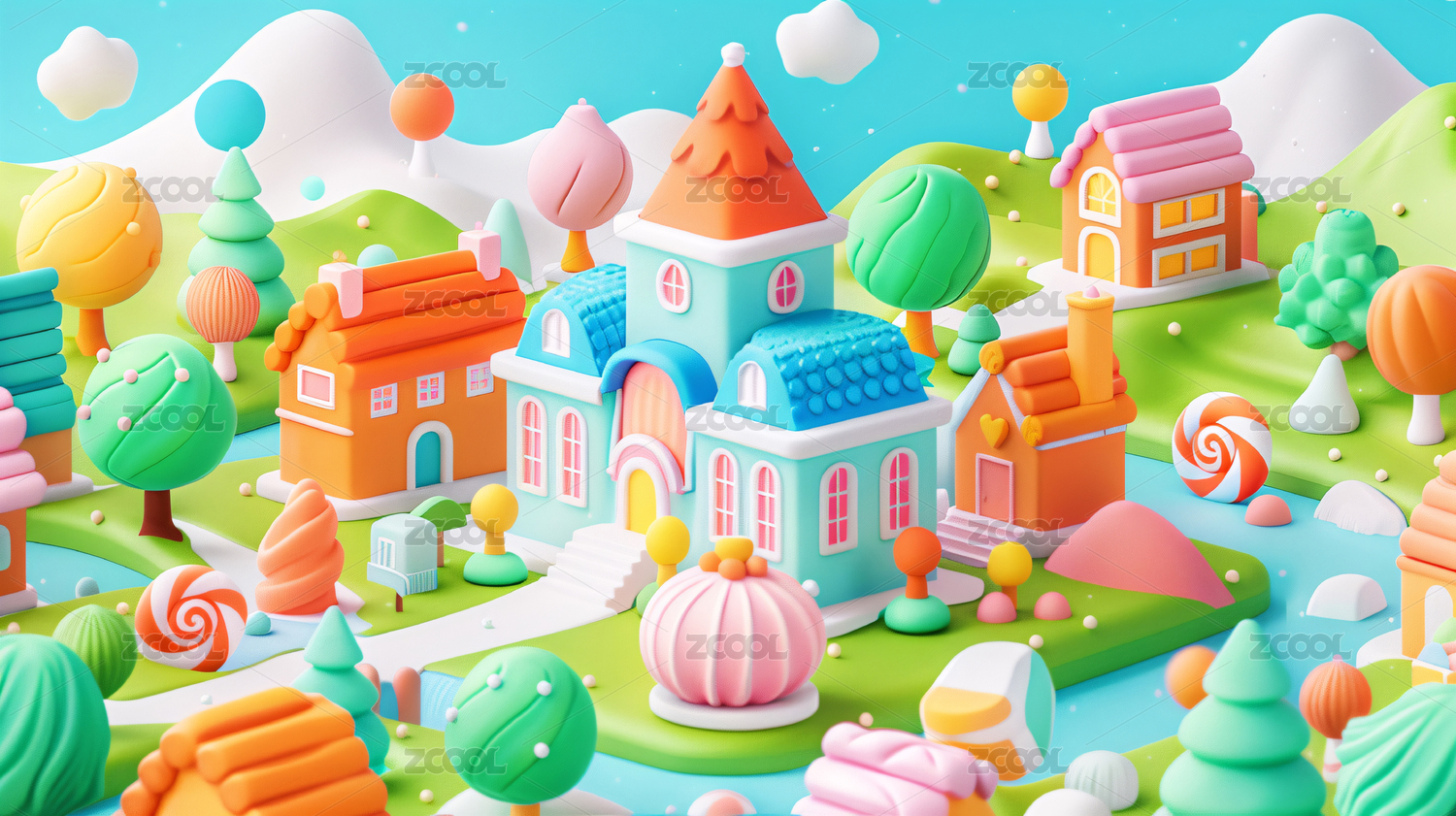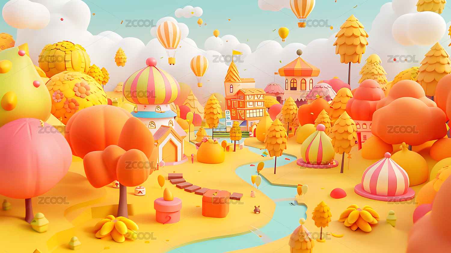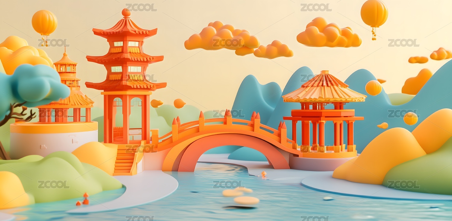 纸艺,山峦,景色,建筑,云朵,天空,房屋,景观,彩色,梦幻