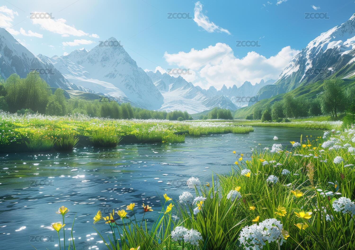 雪山下的草地河流