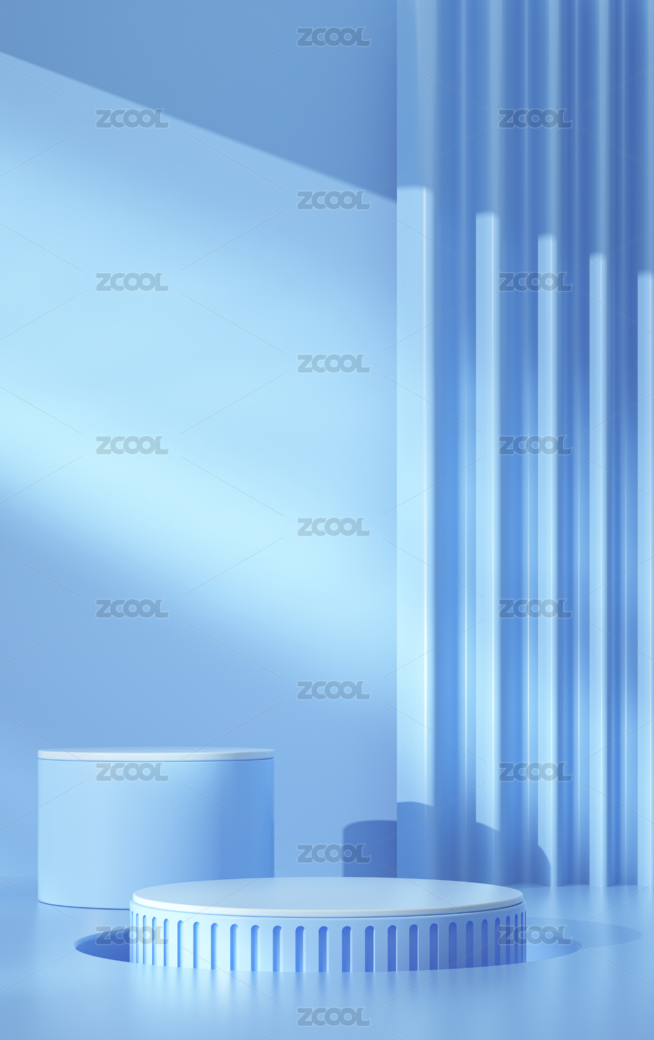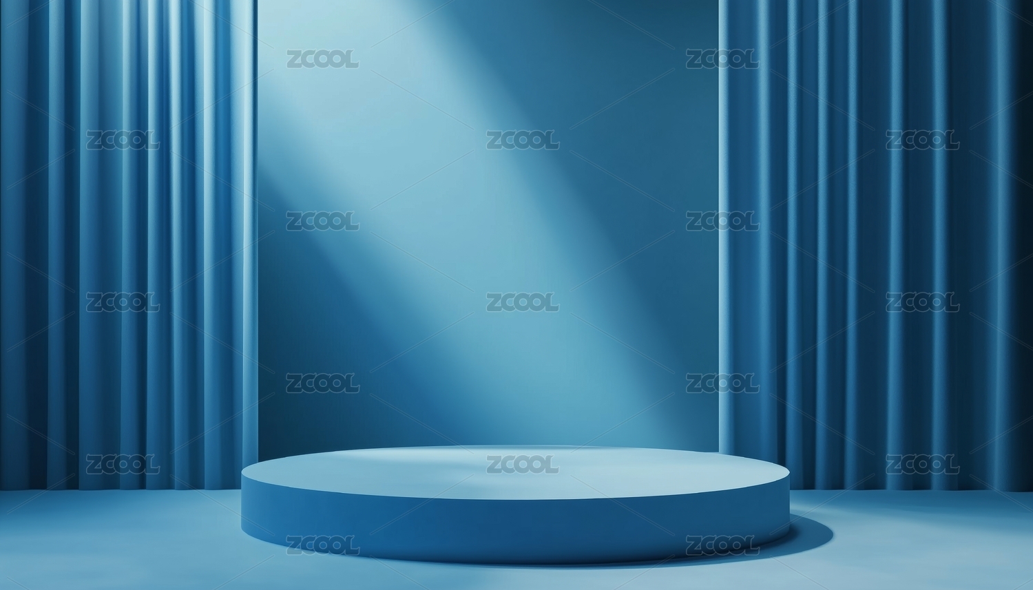 蓝色圆形讲台与垂直帘幕的光影场景