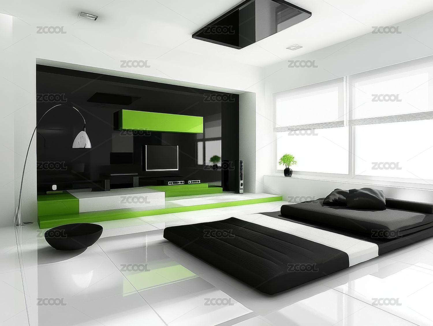卧室,现代,简约,绿色,黑白,室内,设计,床,窗户,植物