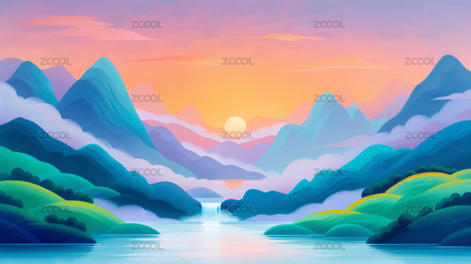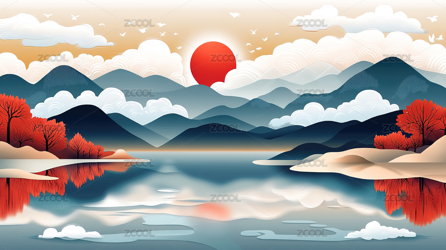 中国风彩色山水矢量插画