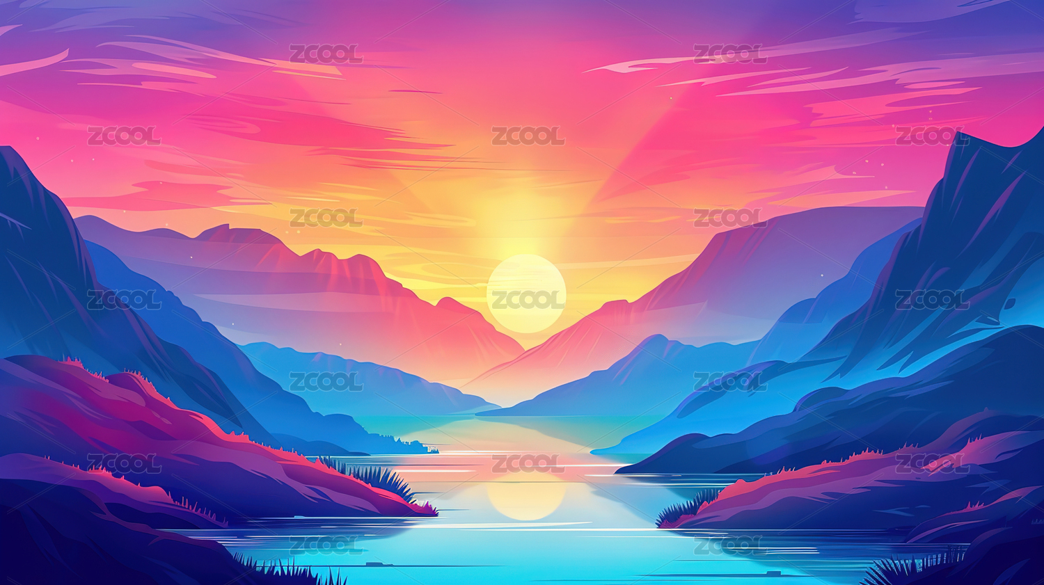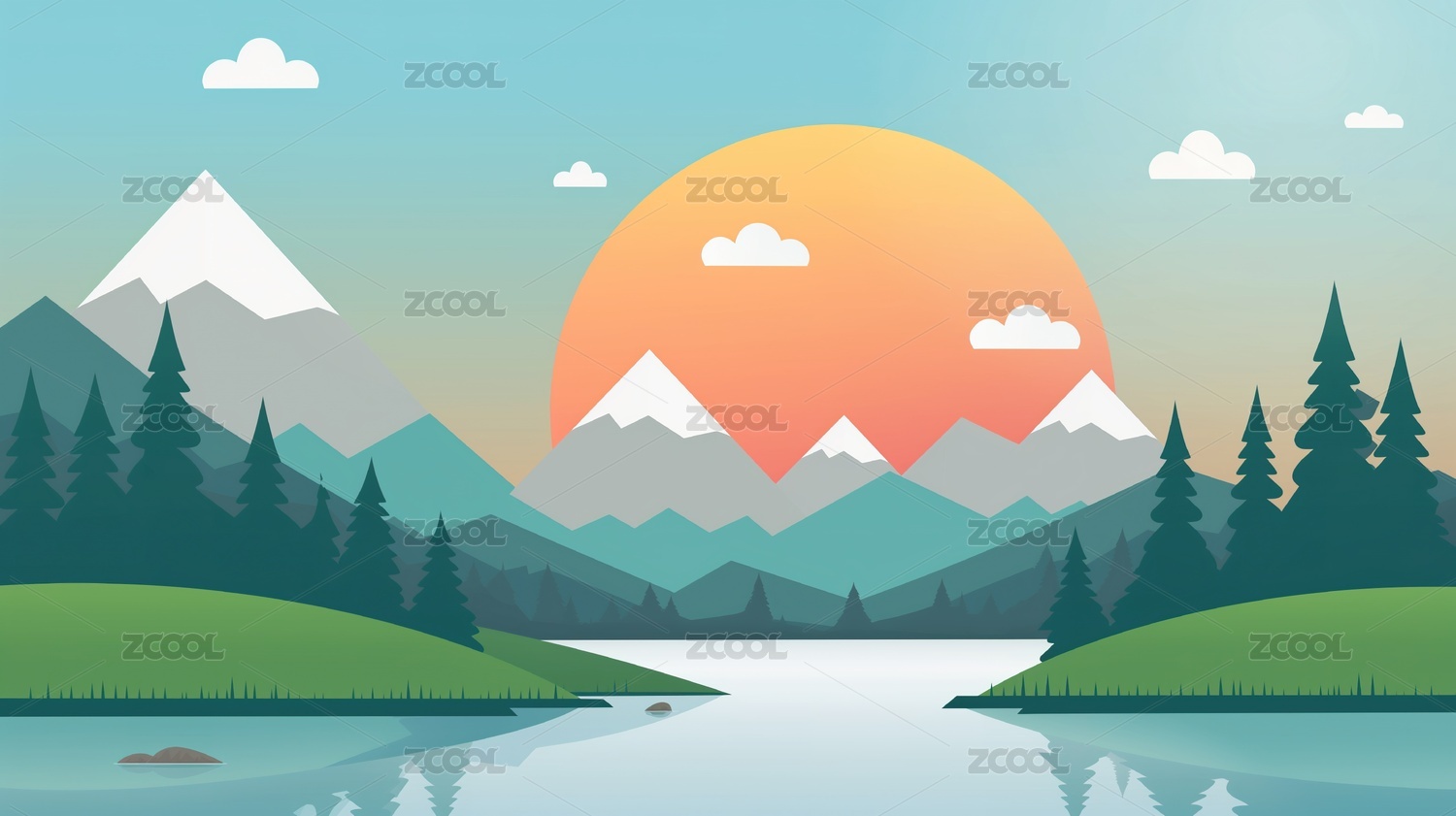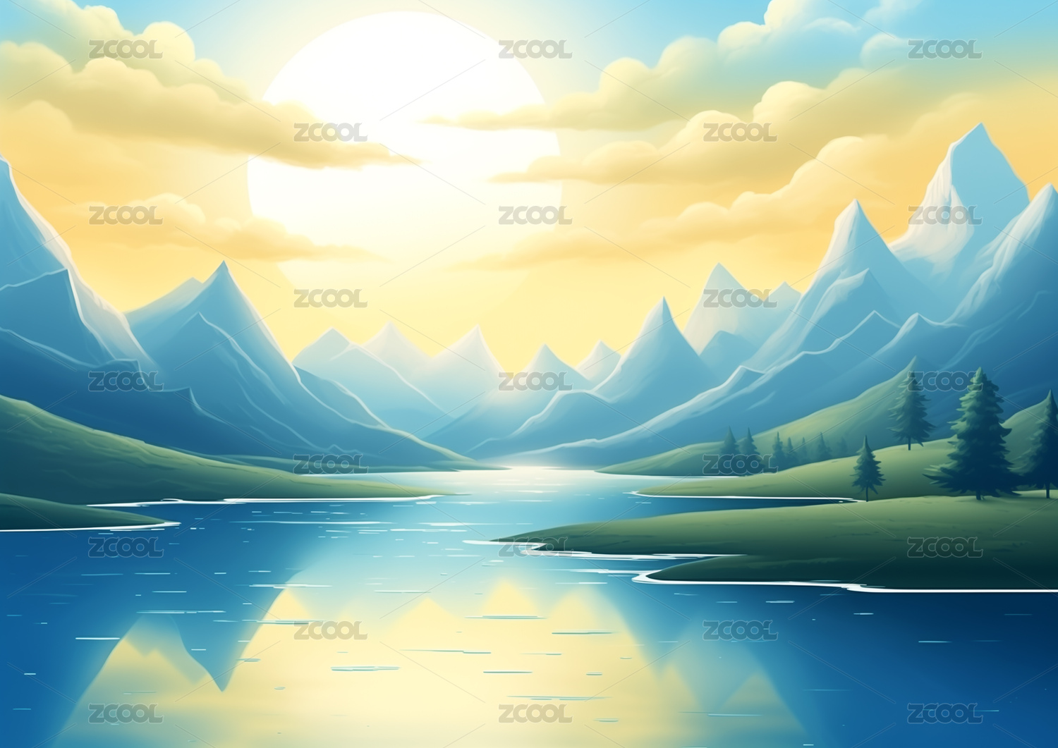 唯美的雪山湖泊插画背景