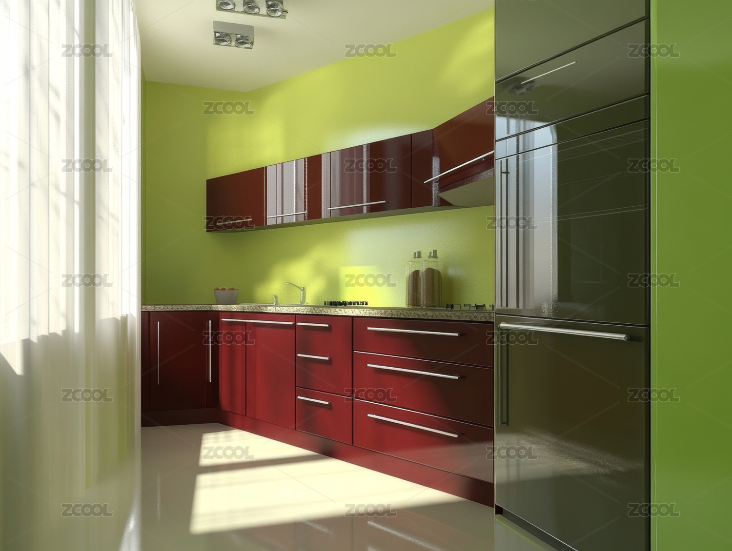 厨房,绿色,现代,橱柜,烤箱,微波炉,水槽,窗户,阳光,植物