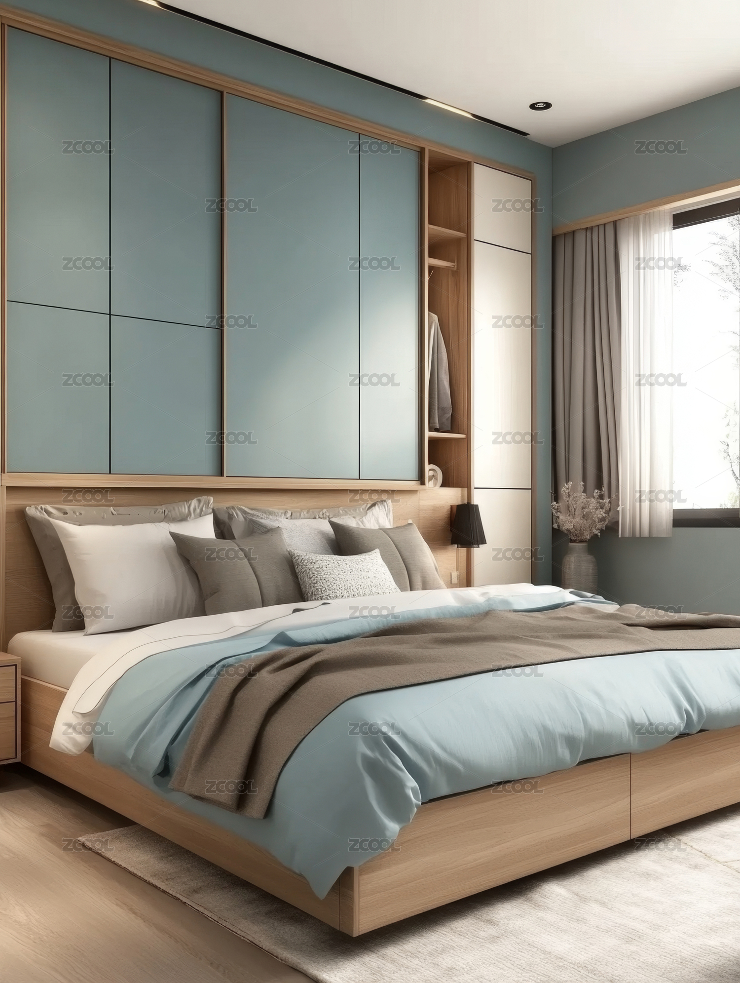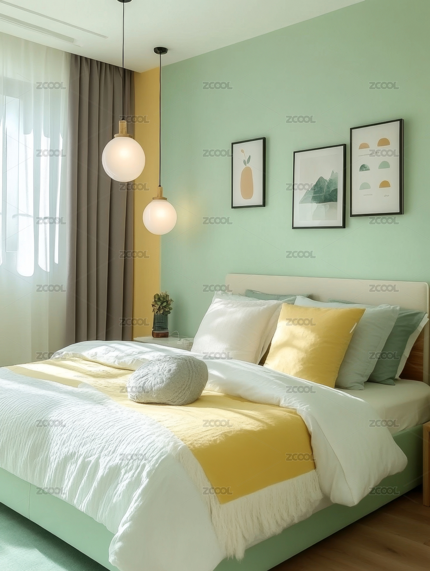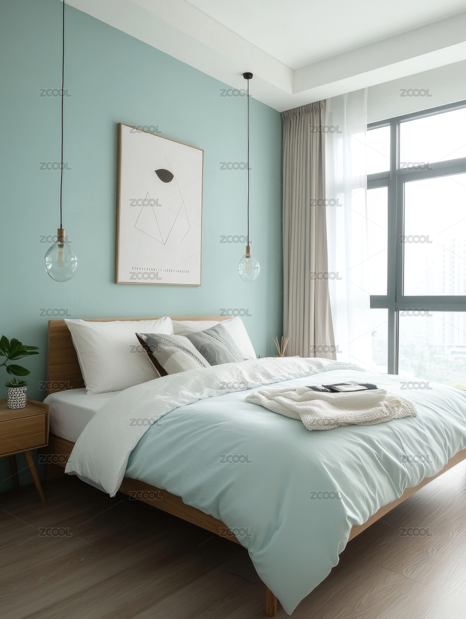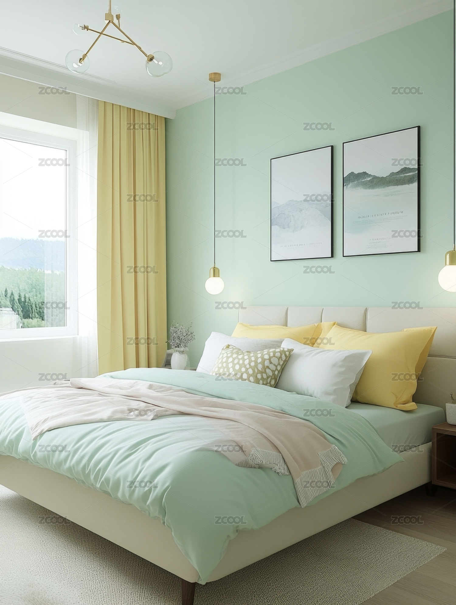 卧室,现代,简约,床,绿色,画作,吊灯,木质,家具,窗帘