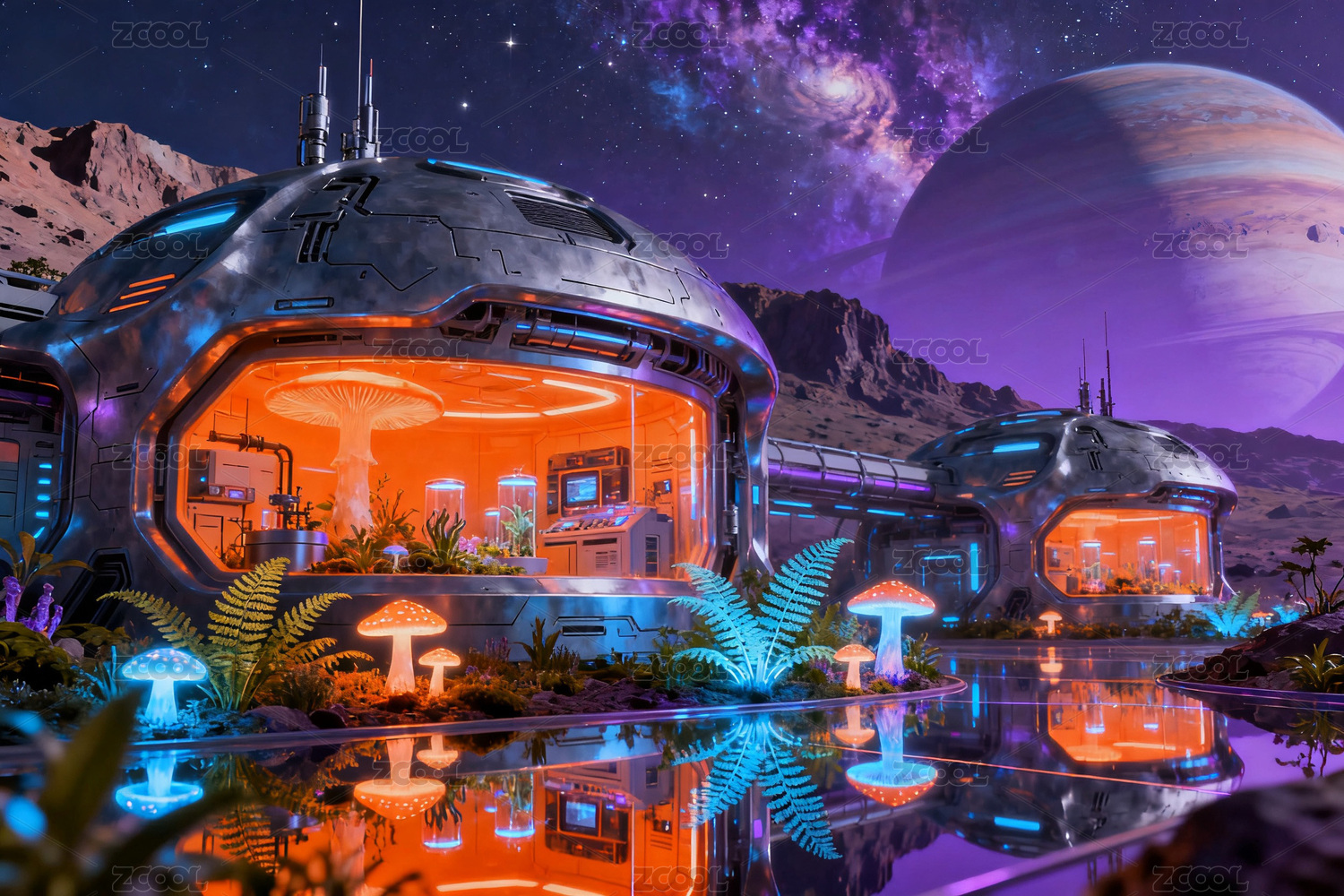 科幻清新明亮外星球荧光色建筑3D立体插画