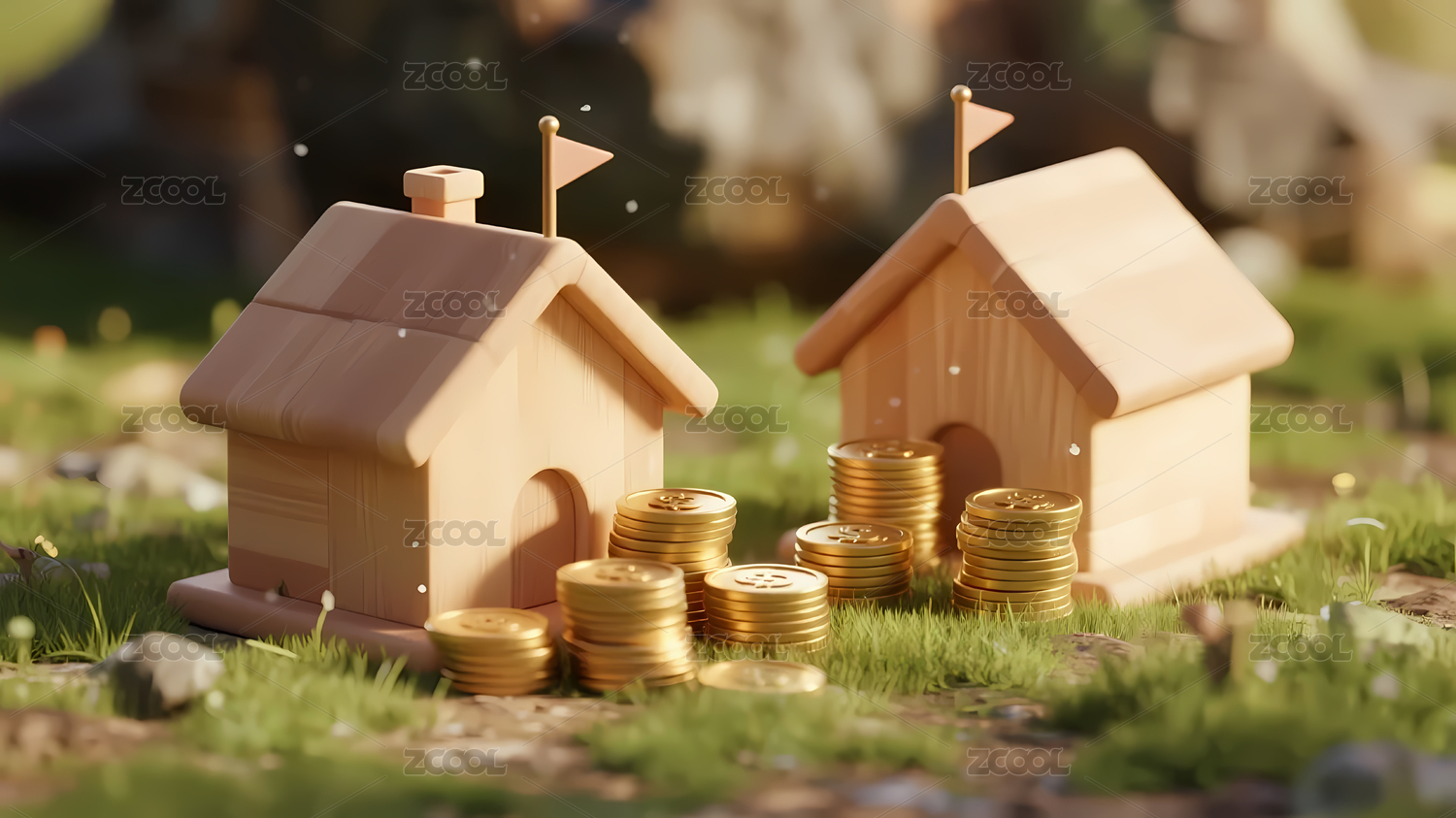 场景,三维, 立体, 3D, 渲染, 模型, 房屋, 金币, 增长, 上涨