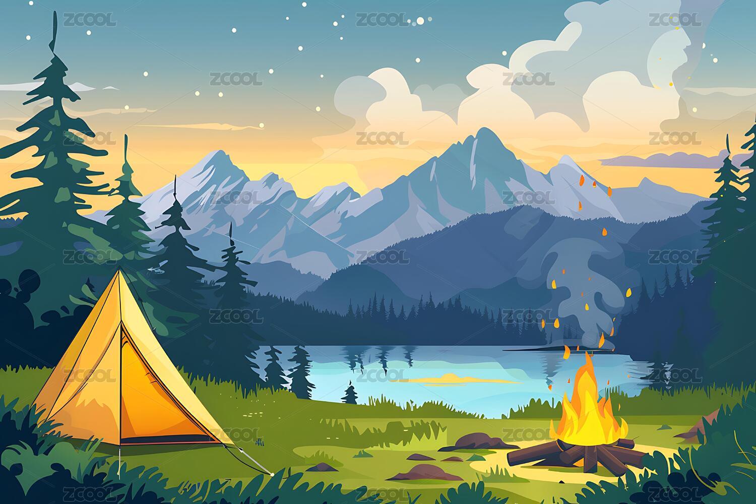 夜晚户外露营帐篷河流湖泊风景插画