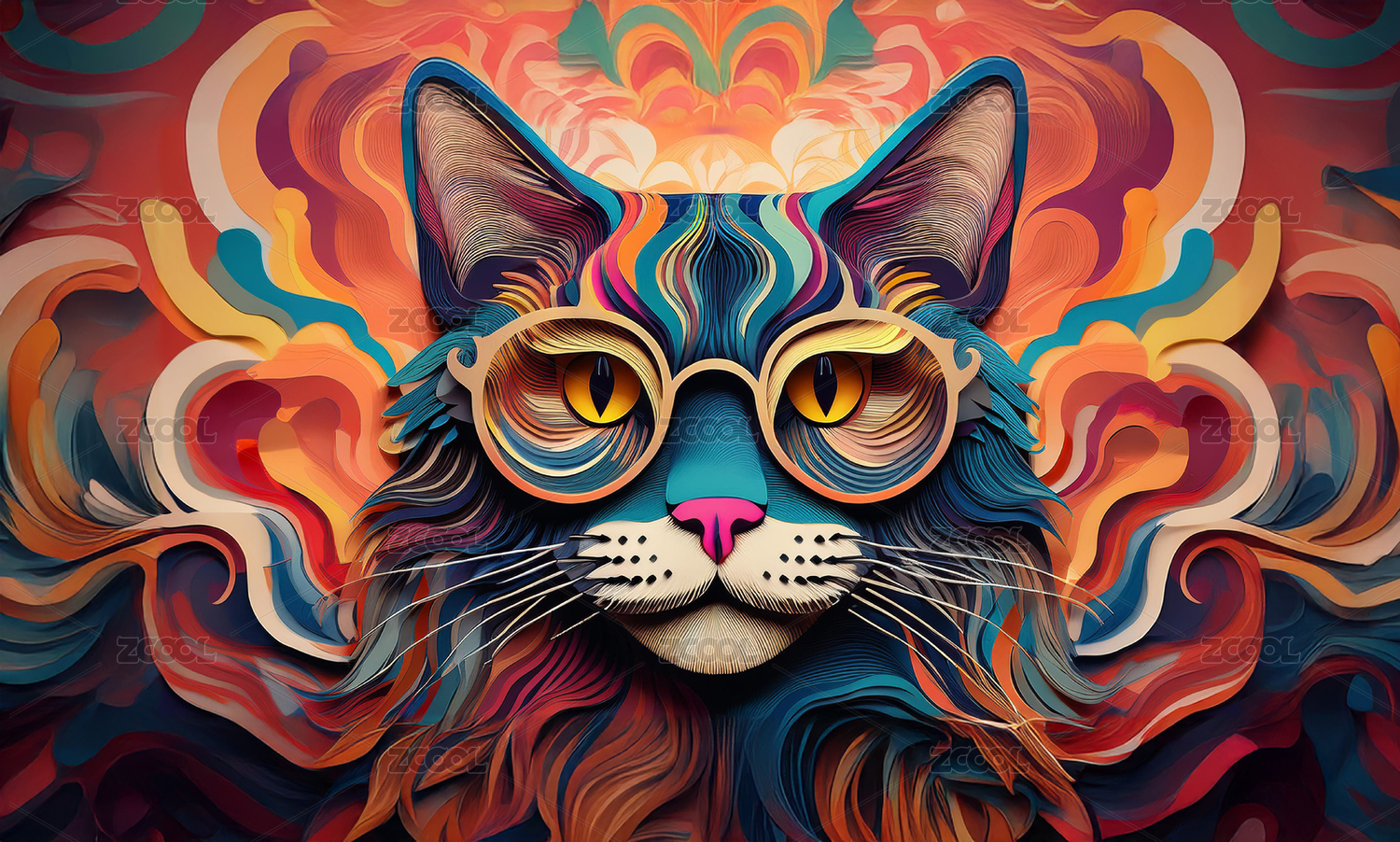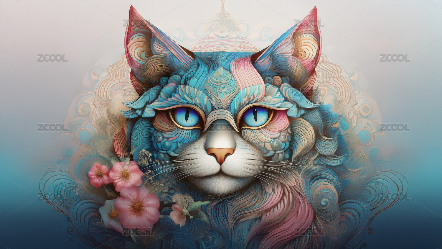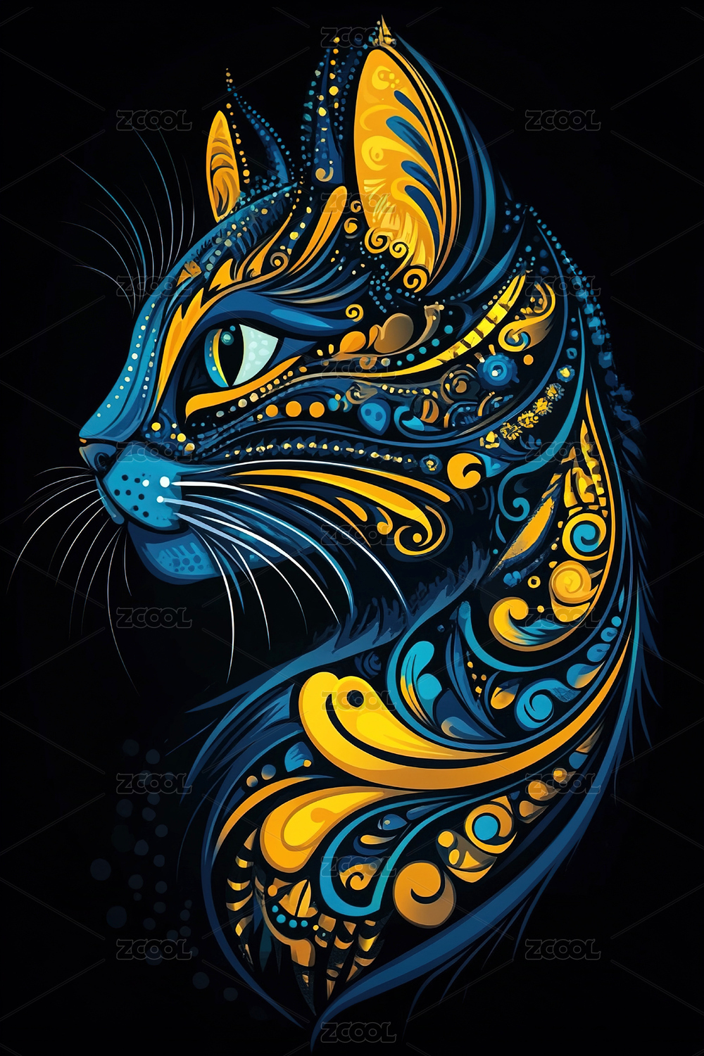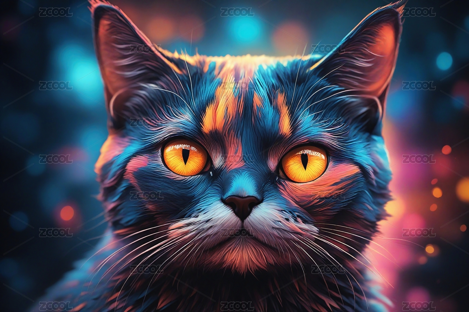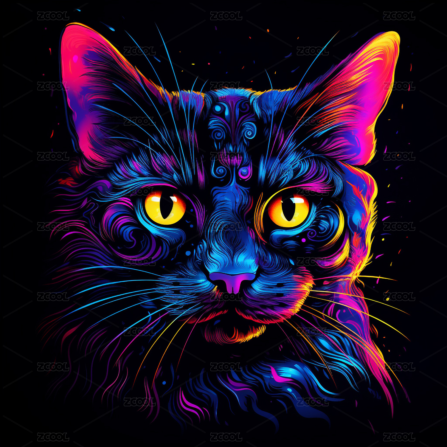 一幅黑色背景上的色彩鲜艳的猫的面部特写