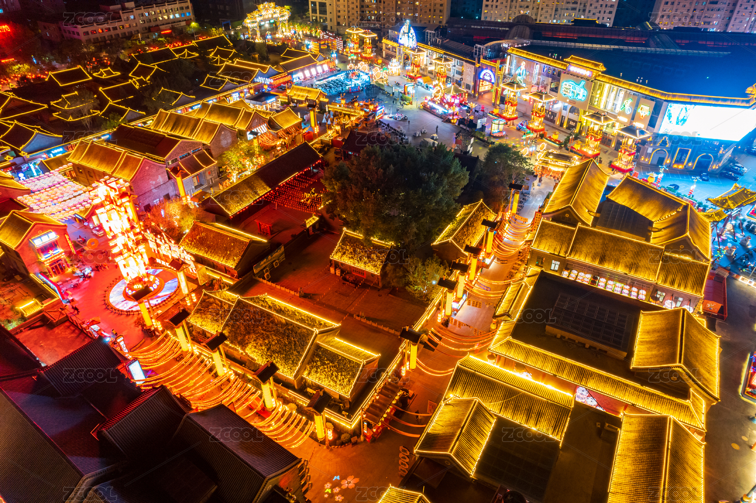 航拍夜间金色的中式传统建筑,柳州窑埠古镇