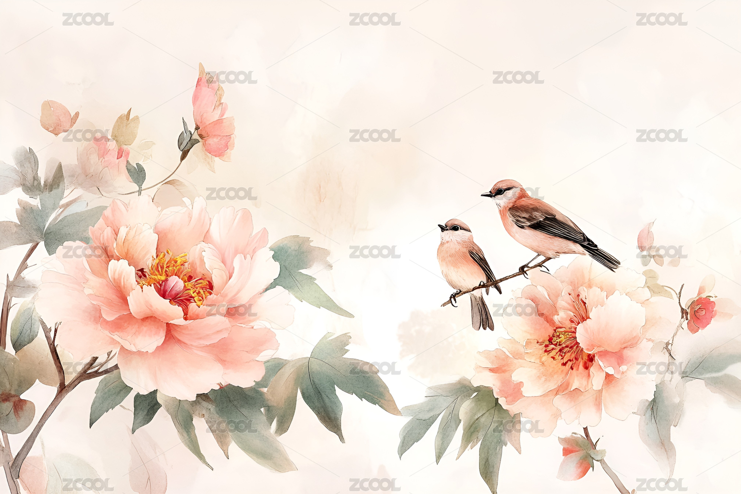 中国风淡彩水墨花鸟植物插画壁纸背景