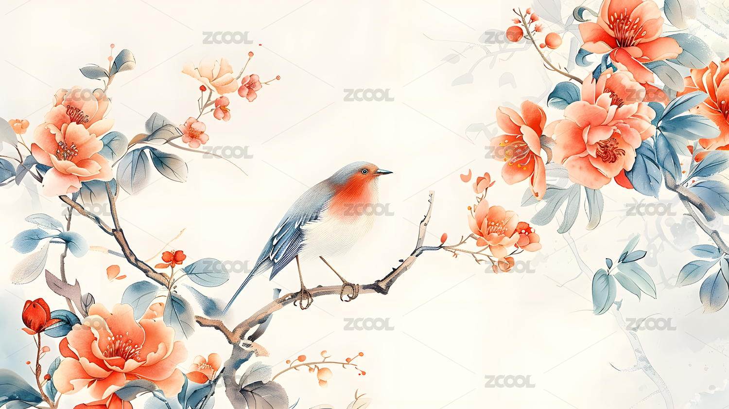 水墨写意红花小鸟枝头栖息
