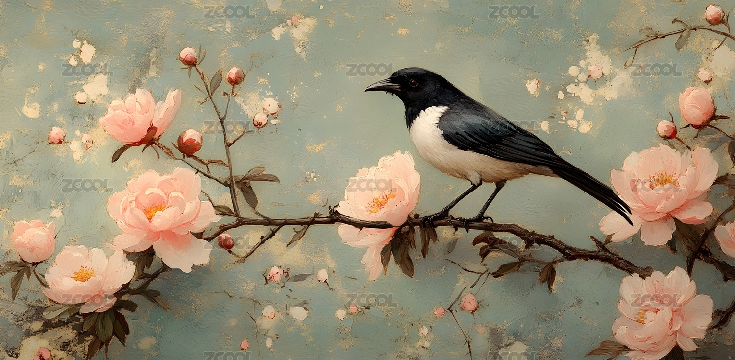 粉红色牡丹花和鸟的艺术画