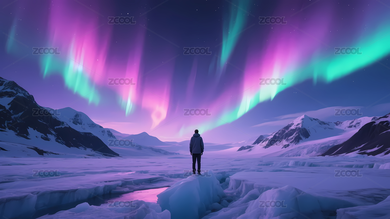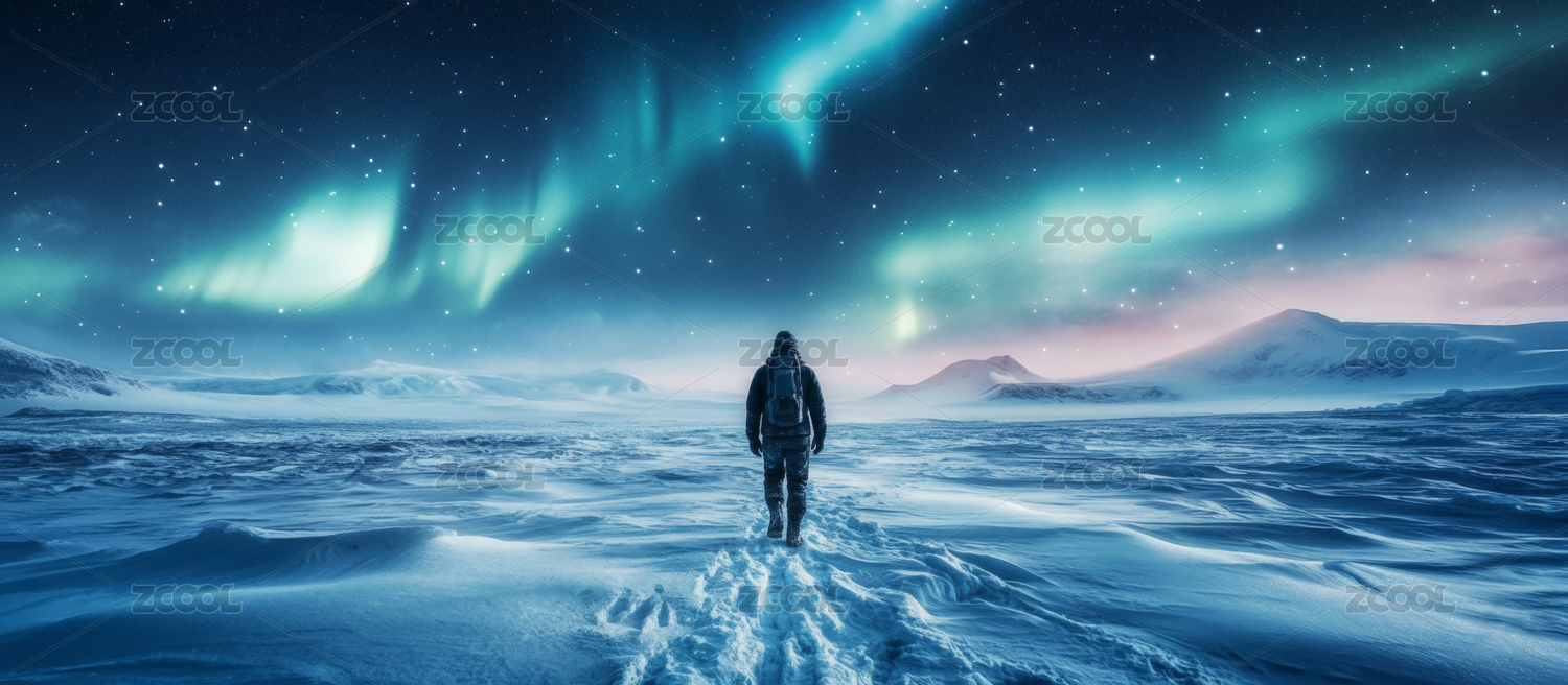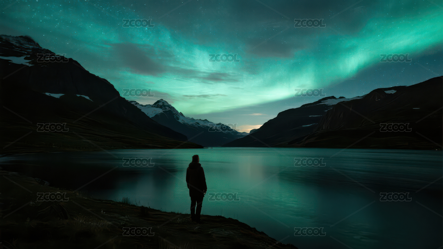 剪影,背影,人物,地面,夜晚,极光,天空,星轨,超现实,地形