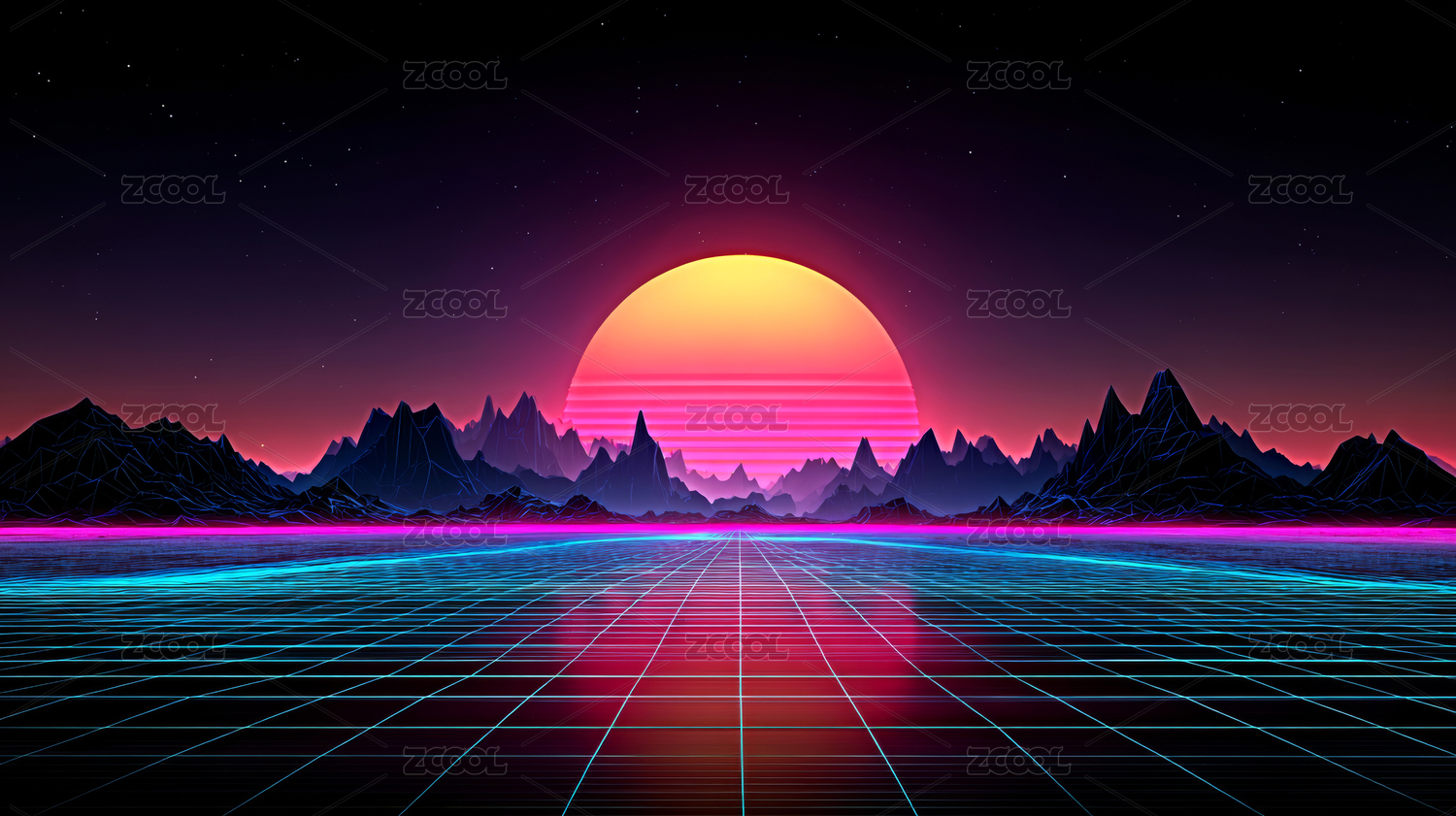 霓虹网格与星空下的山峦
