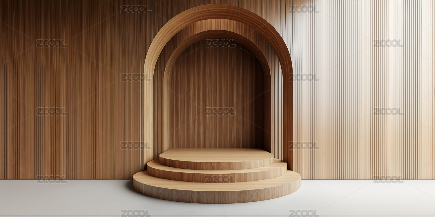 现代,极简,木纹,浅棕,圆形,讲台,空旷,无物,台阶,半圆