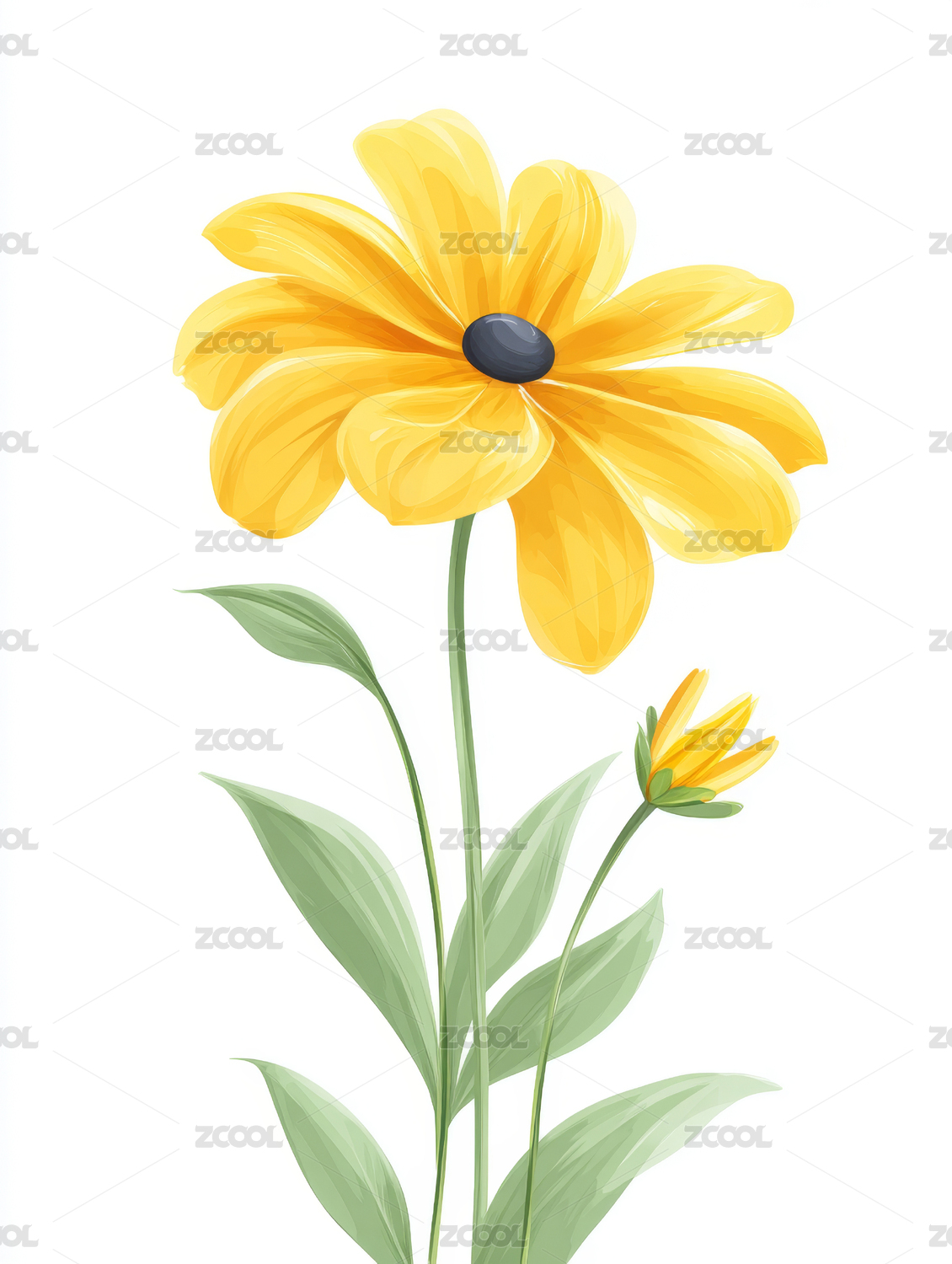 一朵黄色花朵绿叶植物插画