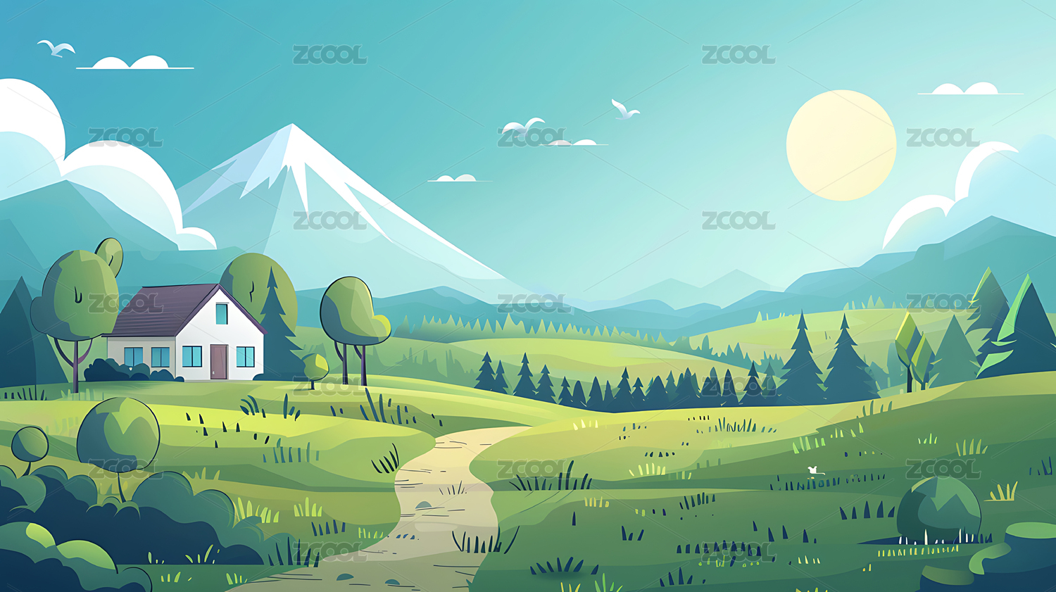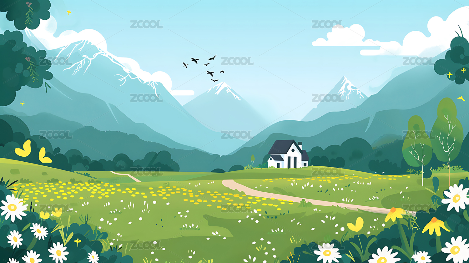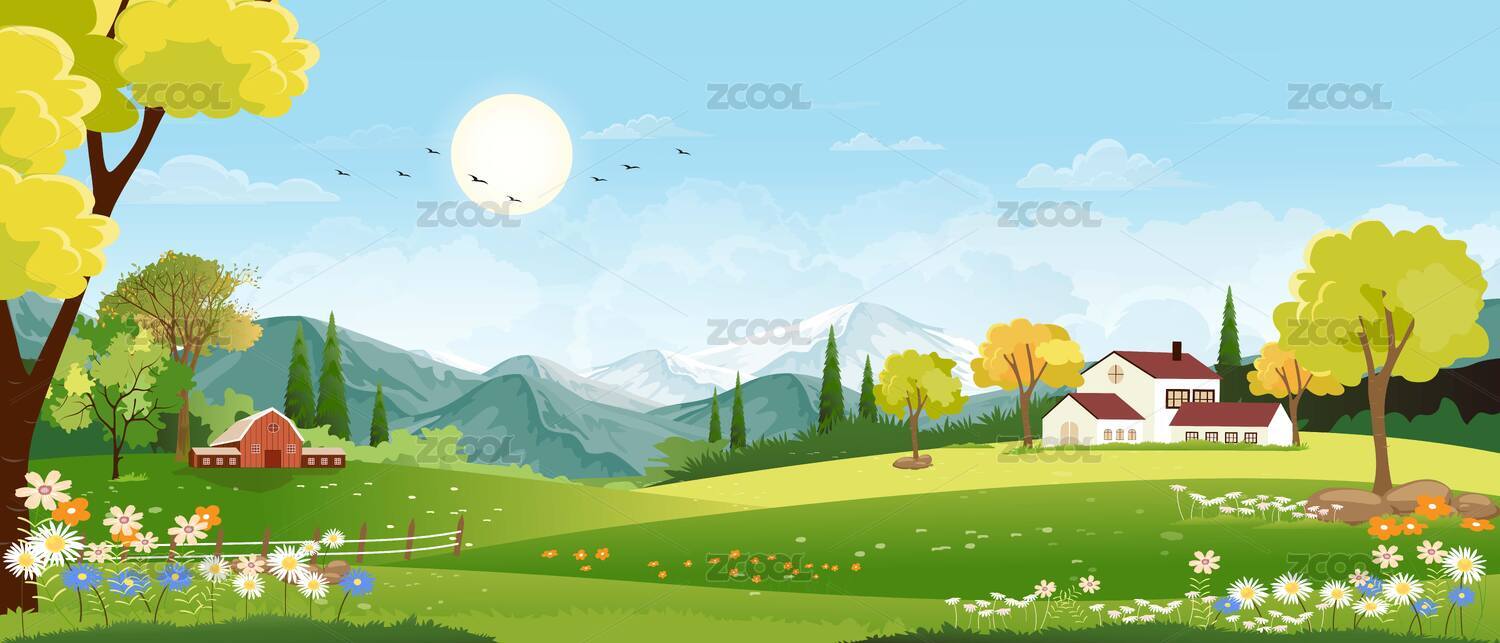 草地, 春天, 自然, 树木, 风景,山脉,房屋,卡通,宁静, 山峰