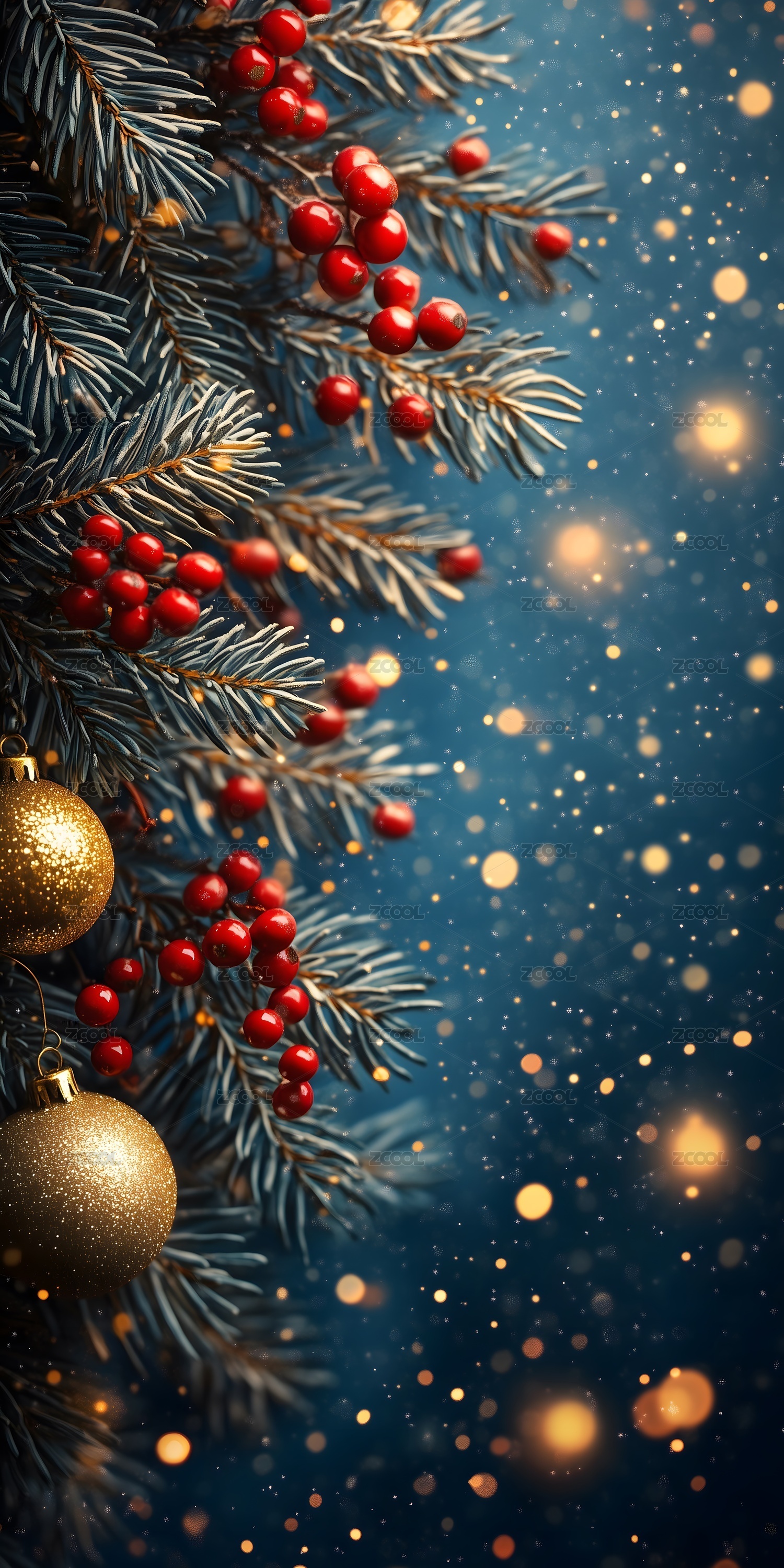 一颗挂在圣诞树上的红色装饰品和红色的浆果