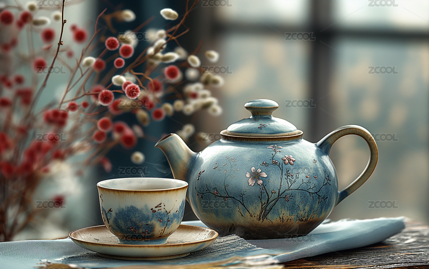 中国风窗台上放着茶壶和茶杯