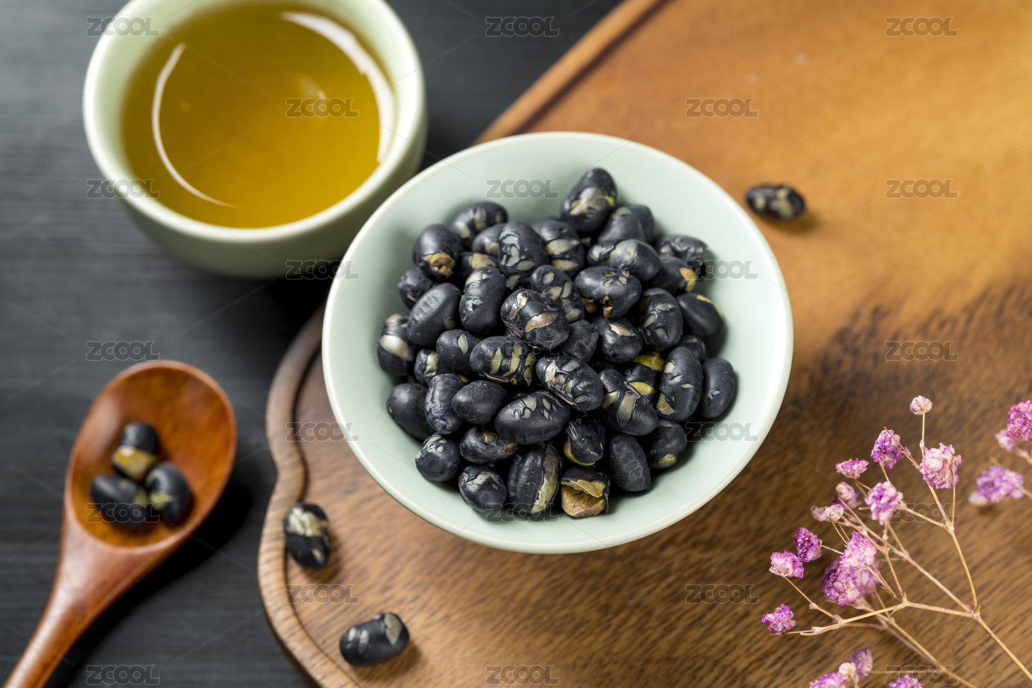 桌面上的盘子里的美味可口的炒黑豆