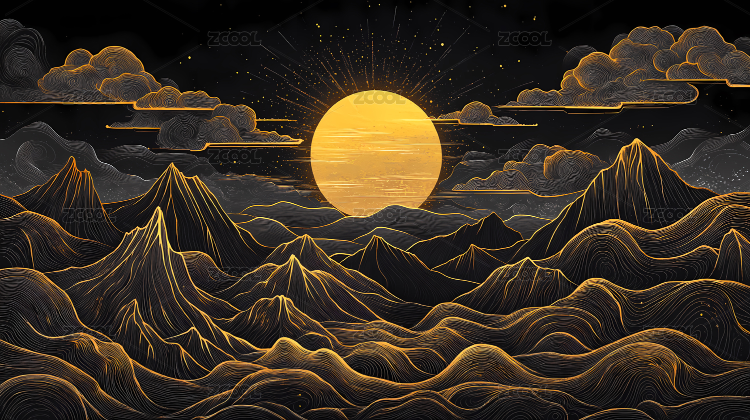 背景,中国风,水墨风,意境,唯美,金色,山脉,圆月,国风,山水
