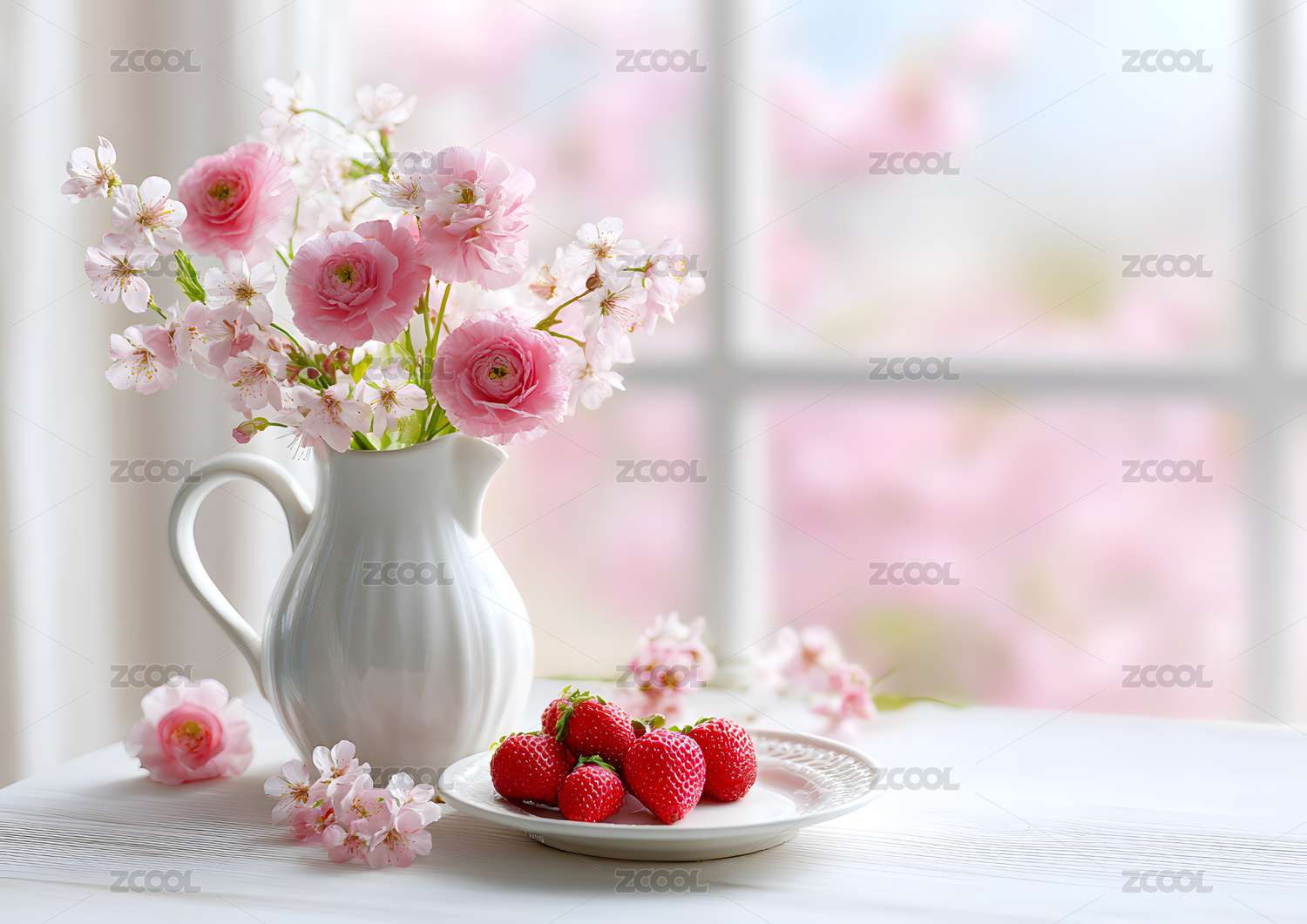 草莓,花瓶,鲜花,粉色,静物,美食,甜点,水果,餐桌,室内