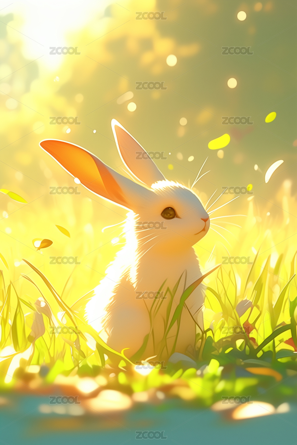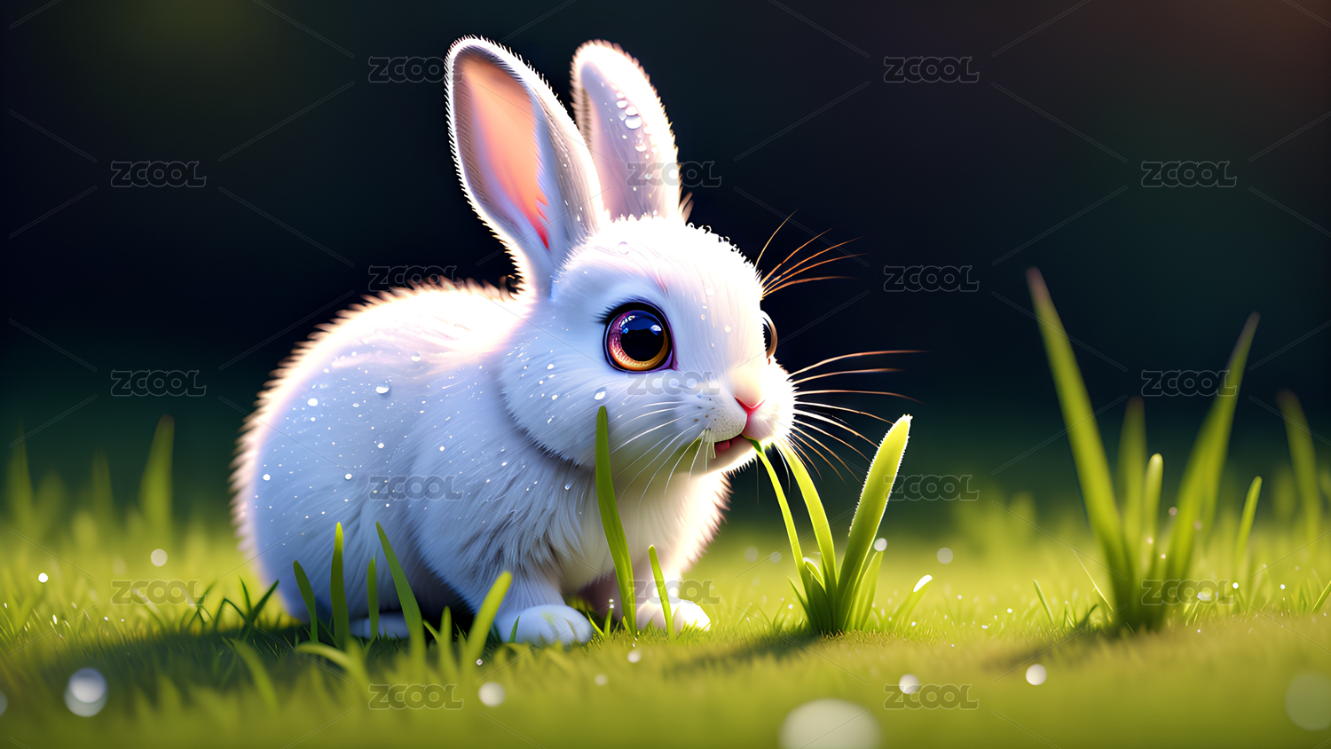 可爱的卡通兔子在草地上吃草动物插画壁纸