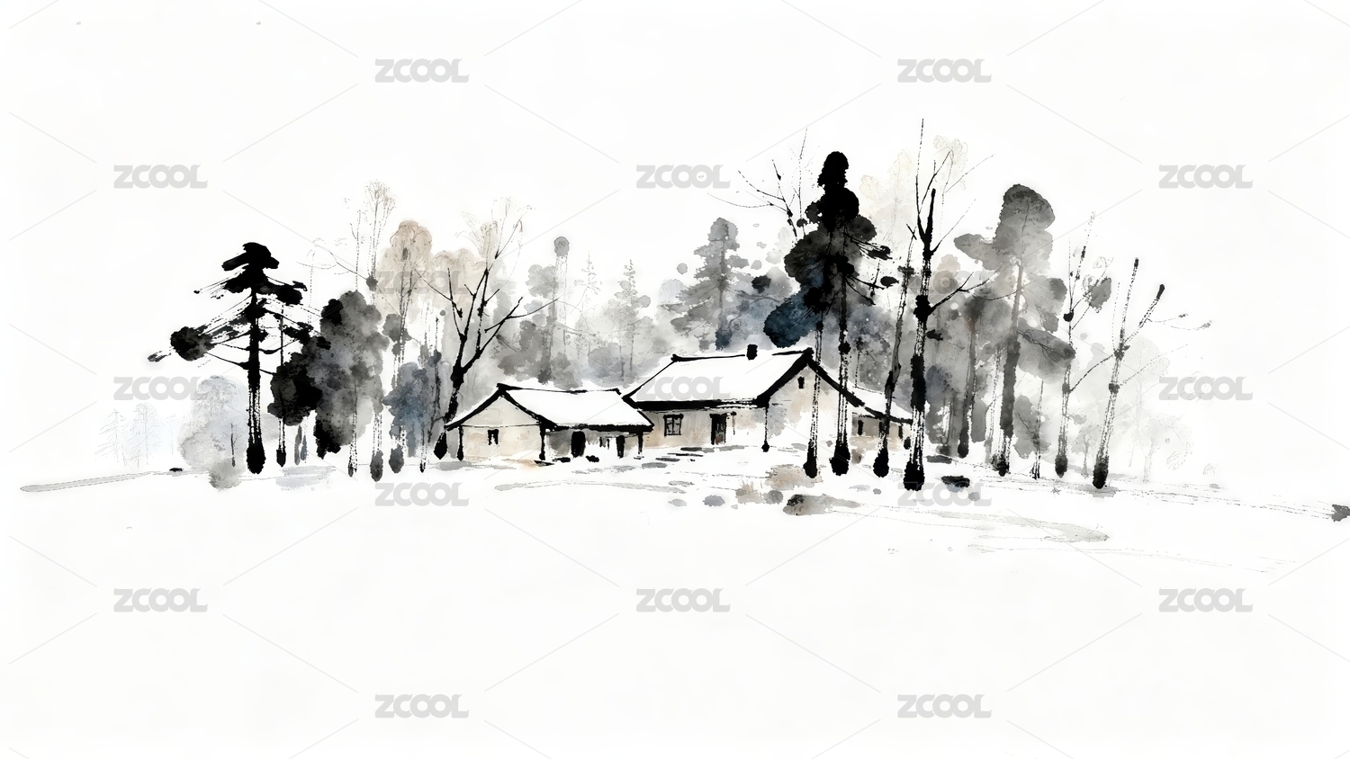 冬日林间小屋水墨画