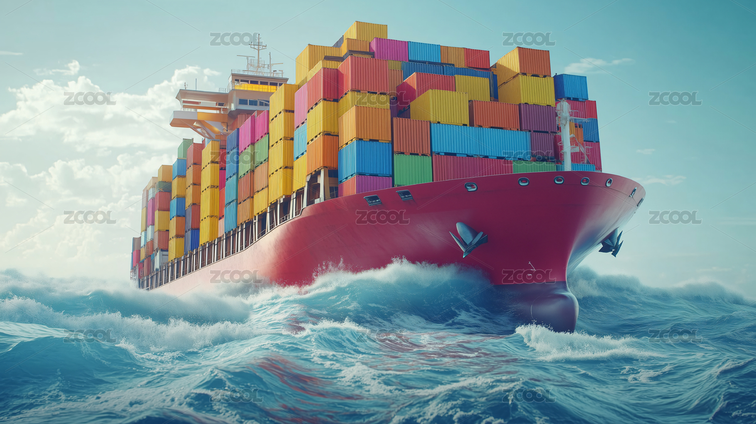 装满集装箱的货轮在大海上航行
