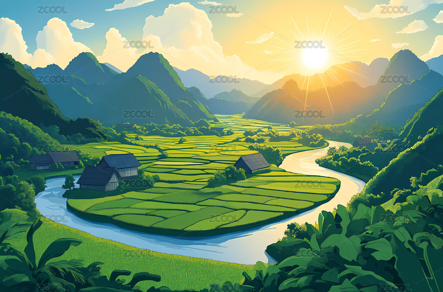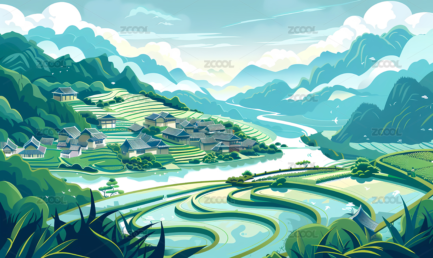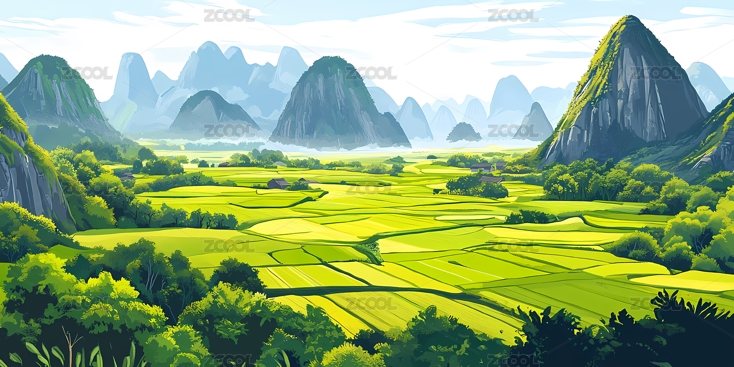 田园绿野山川风景插画