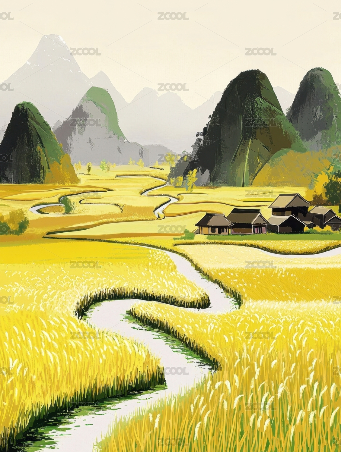 唯美田园自然风景插画