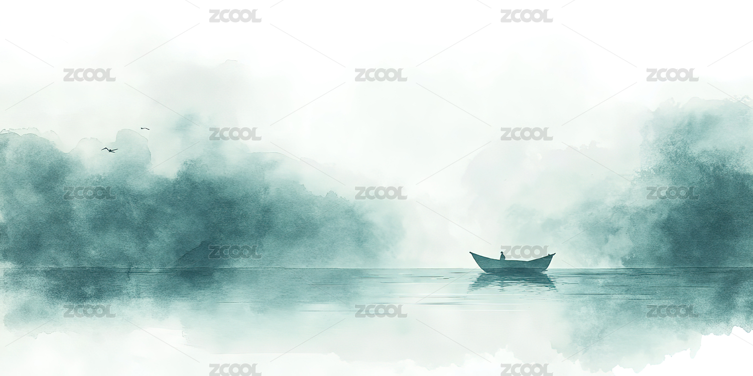 水墨画,船,孤舟,意境,水面,倒影,烟雾,云雾,留白,极简
