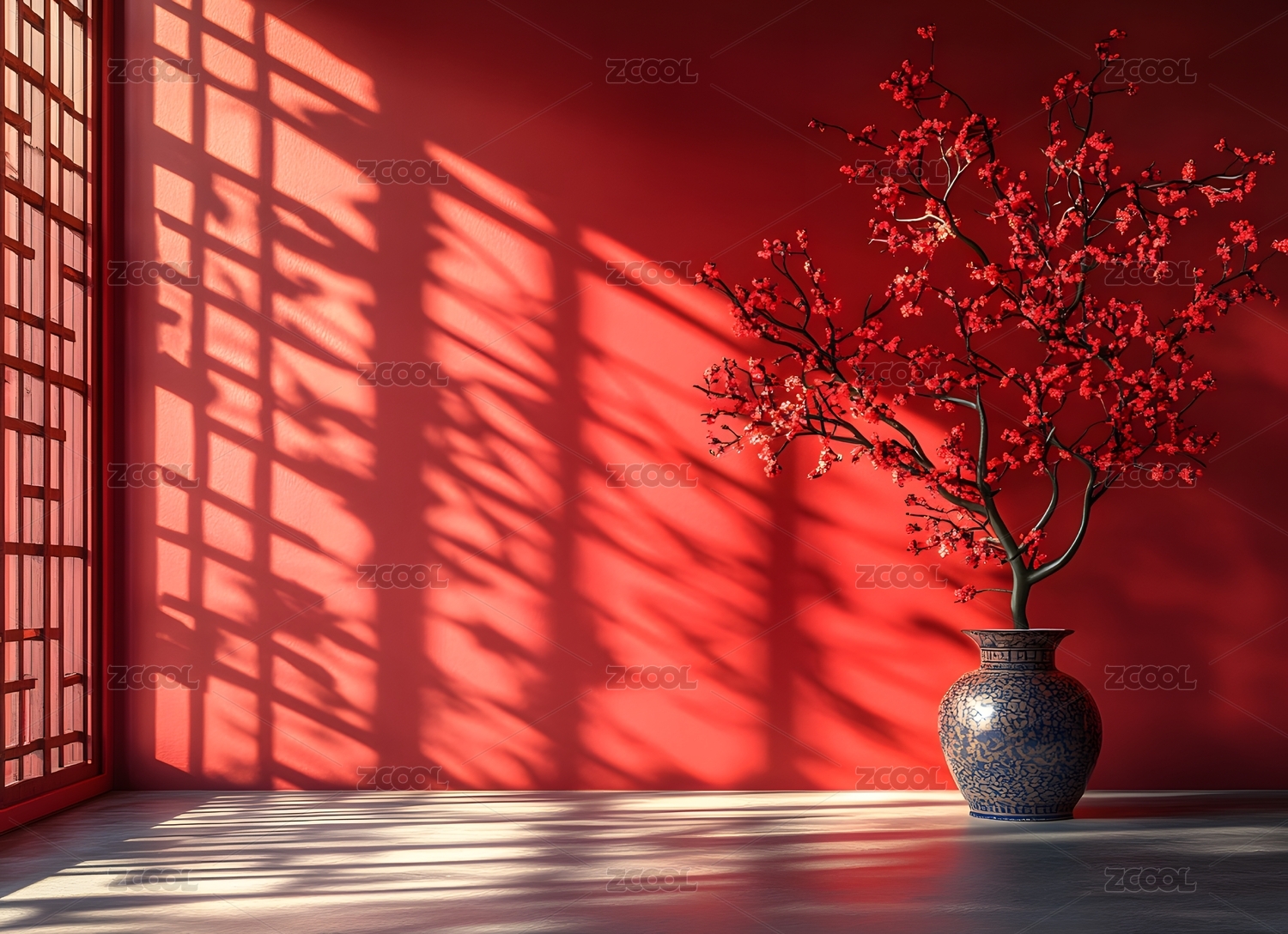 红色背景中国风室内装饰,光影婆娑